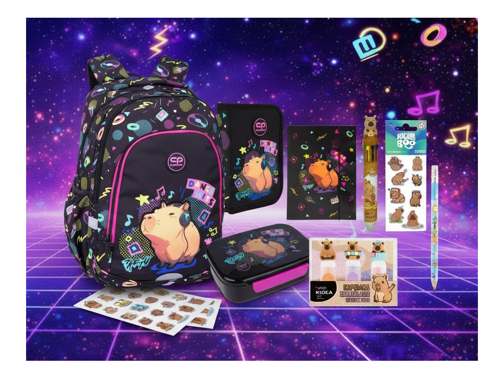 🎒Sada 9ks KAPYBARA MUSIC!🎵 Batoh 16", penál, box na sváču, desky, 10barevná propiska a další!✨ Buď stylový s nejvíc cool zvířátkem!🐾 Skladem zde!🛒 Kupuj teď!🔥