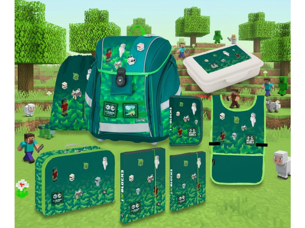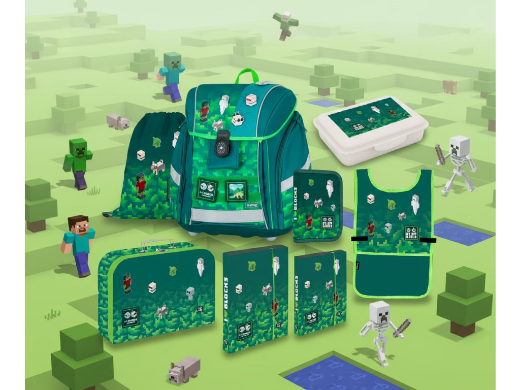 Oxybag Školní set 8ks PREMIUM LIGHT Playworld ve stylu Minecraft sada batoh, penál, sáček, kufr, boxy na sešity, zástěrka, box na svačinu 0-75726/08