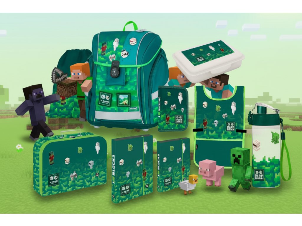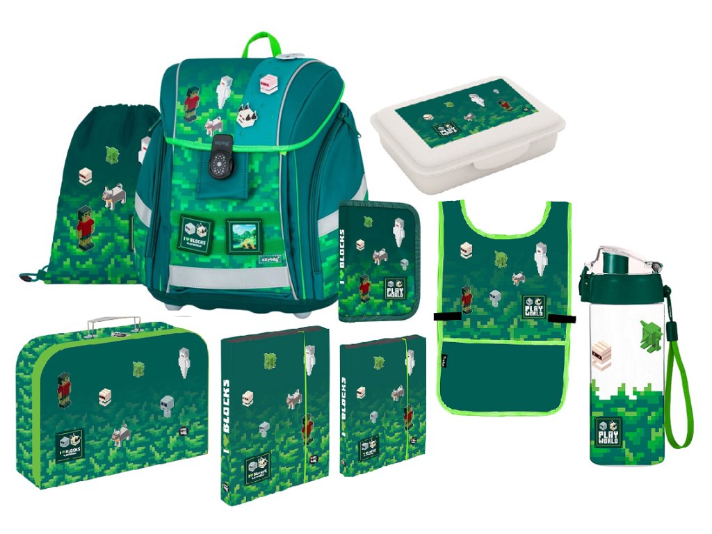 Oxybag Školní set 9ks PREMIUM LIGHT Playworld ve stylu Minecraft sada batoh, penál, sáček, kufr, boxy na sešity, zástěrka, box na svačinu, láhev 0-75726/09