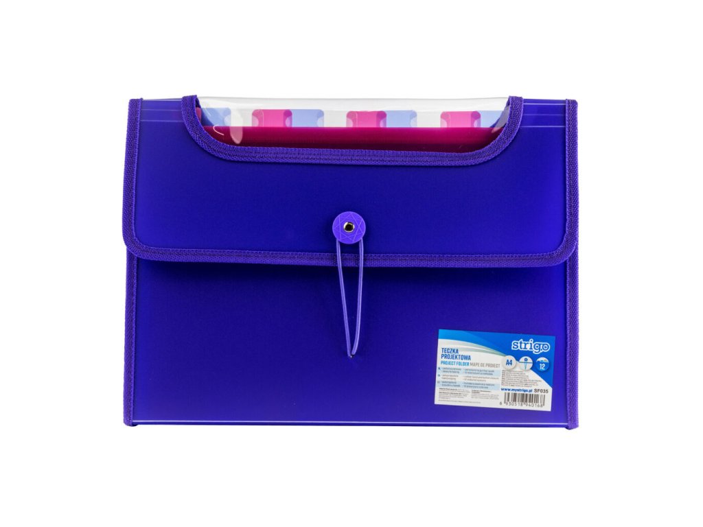 Fialová složka A4 s 12 kapsami / přehrádkami se zapínáním na gumu a knoflík.Doplňkové parametry