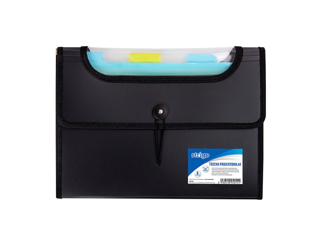 Černá složka A4 s 6 kapsami / přehrádkami se zapínáním na gumu a knoflík.Doplňkové parametry