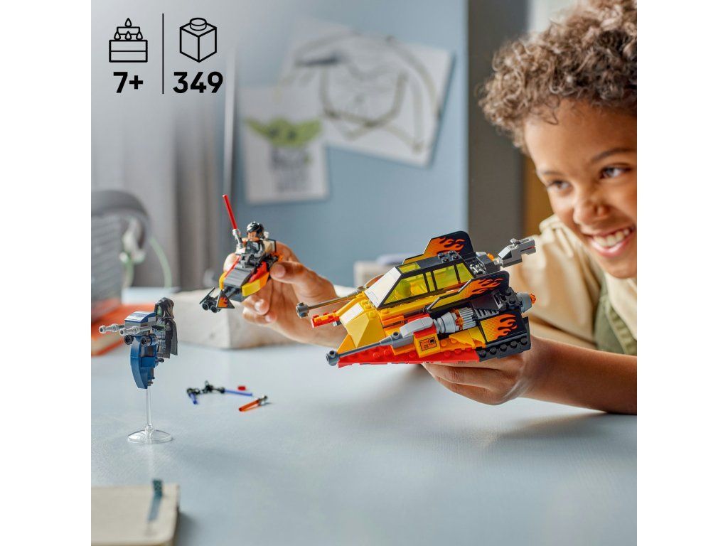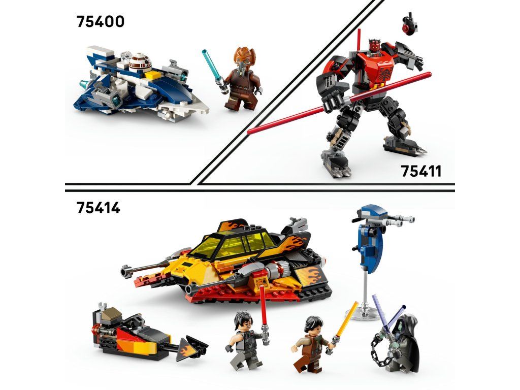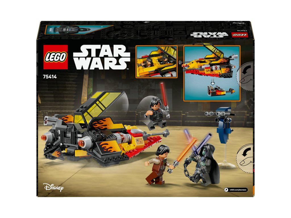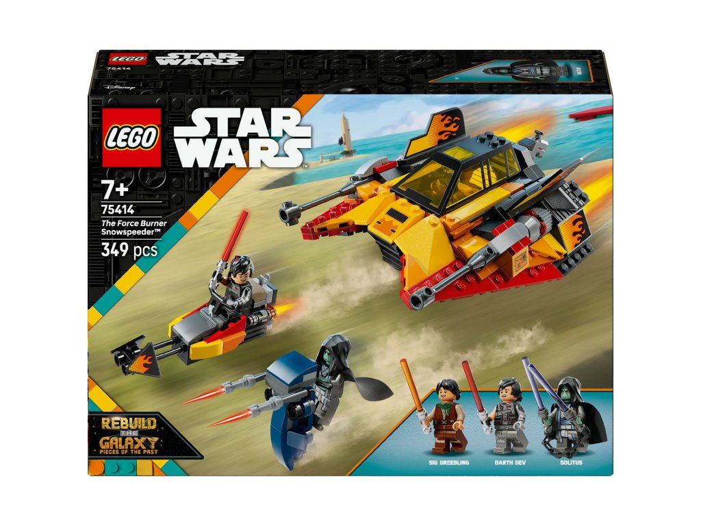 Připravte se na rychlou akční hru s modelem Sněžný spídr Force Burner (75414). Představuje úchvatný dárek ze světa Star Wars™ pro kluky, holky a fanoušky od 7 let a obsahuje autentické prvky jedinečného sněžného spídru z 2. řady seriálu LEGO® Star Wars: Přestavba galaxie. Spídr je zdobený potisky plamenů, má otevírací dvojitý kokpit se skrytou odnímatelnou spídrovou motorkou a zadní vystřelovač. Zatlačte na sedadlo v zadní části kokpitu (nebo na hlavu minifigurky LEGO, která v něm sedí) a nastartujte spídrovou motorku. Tato stavebnice obsahuje také vůbec první minifigurky LEGO Star Wars Siga Greeblinga, Darth Deva a Solita. Každá postava má vlastní světelný meč, včetně Solitova dvojitého světelného meče s řetězem, a Solitus má navíc také skvělý STAP spídr na akční souboje. Stavebnice obsahuje 349 dílků.Doplňkové parametry