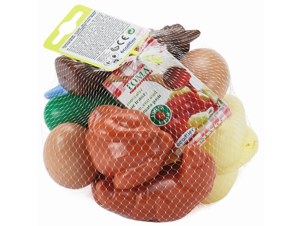 Makety různých potravin, v síťce. S touto sadou máte všechny ingredience pro perfektní snídani. Obsahuje balení vajíček a 2 vejce, kuře, párek, mrkev, okurku, croisant, rajskou omáčku a polevy. Ideální také jako vybavení obchodu nebo jako doplněk do dětské kuchyňky. Rozměry produktu (DxŠxV): 19 x 19 x 13 cm.Doplňkové parametry