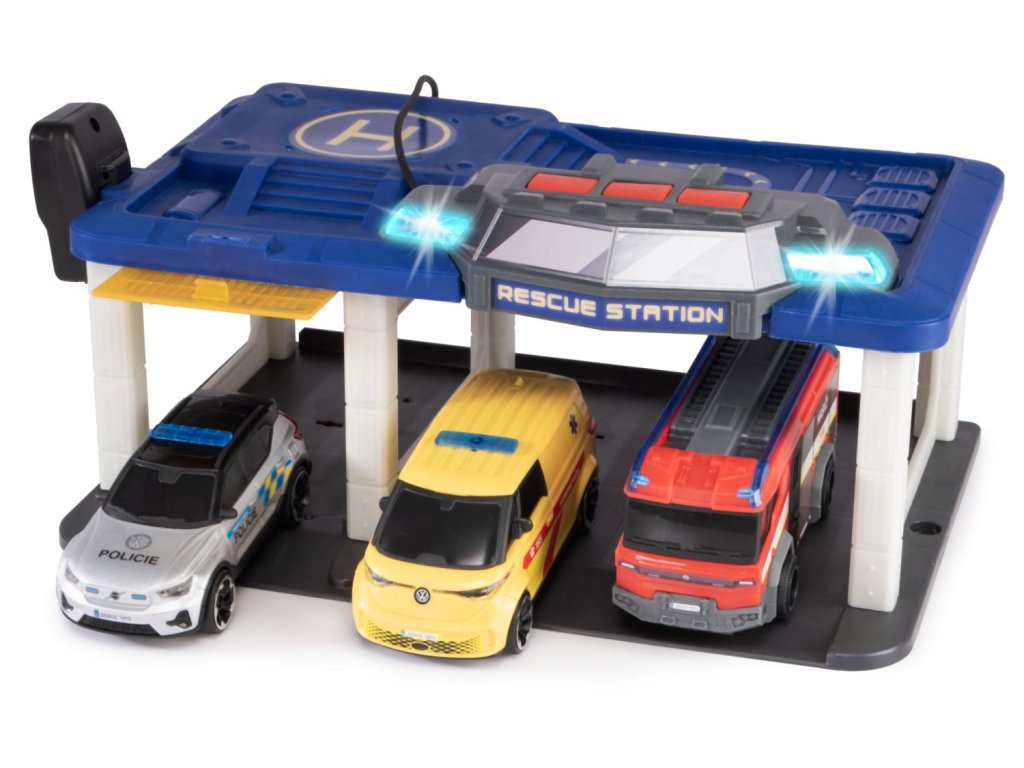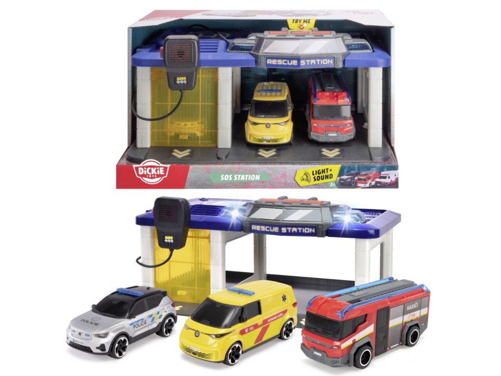 SOS Záchranářská stanice se světlem, zvukem, funkčním mikrofonem a otevíracími vraty. Hasičské auto (Rosenbauer Penta), policejní auto (Volvo XC40 Recharge) a ambulance (Volkswagen ID. Buzz) - auta na volnoběh. Rozměry 31 x 22 x 16 cm. Česká verze.Doplňkové parametry