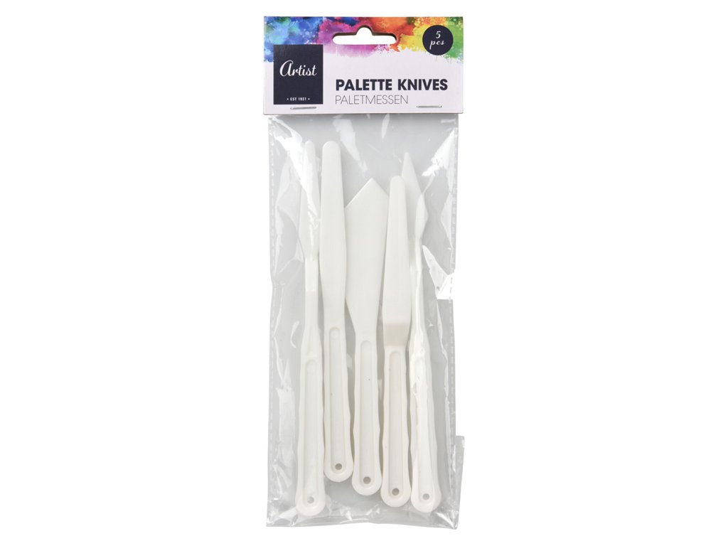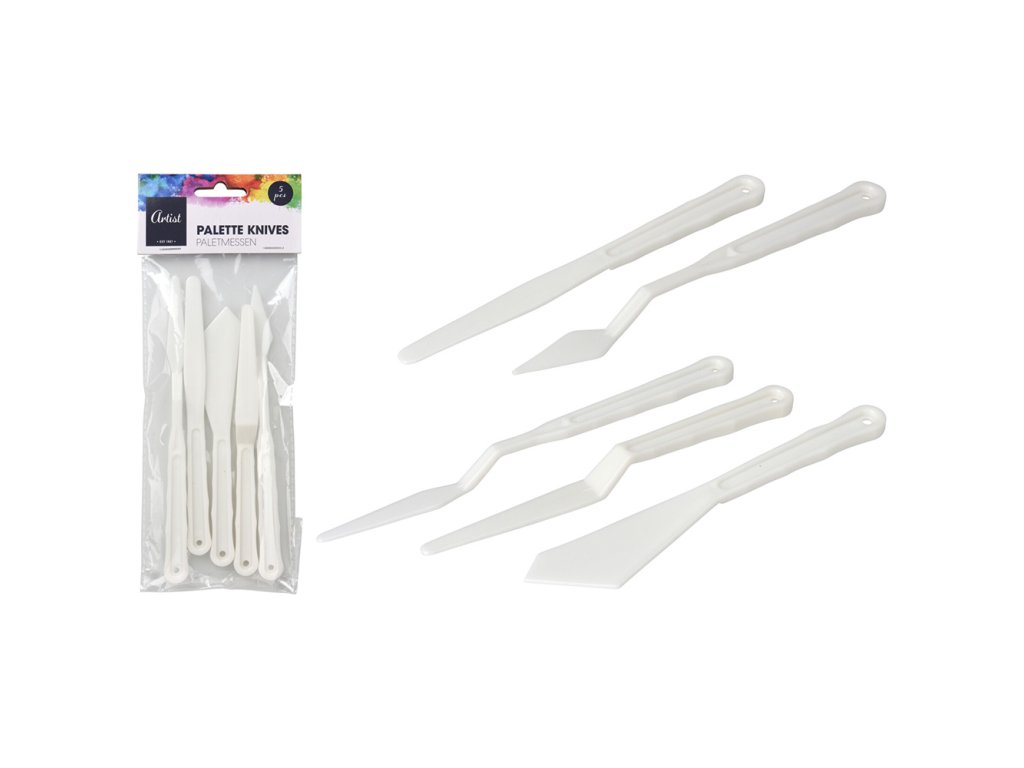 5 dílná plastová souprava paletových špachtlí ideální pro začínající umělce. Díky provedení z pevné ale pružné umělé hmoty jsou tyto špachtle bezpečnější pro použití než kovové nože, snadno se udržují a jsou odolné proti znečištění. Ideální pro nanášení masy akrylových a olejových barev.Doplňkové parametry