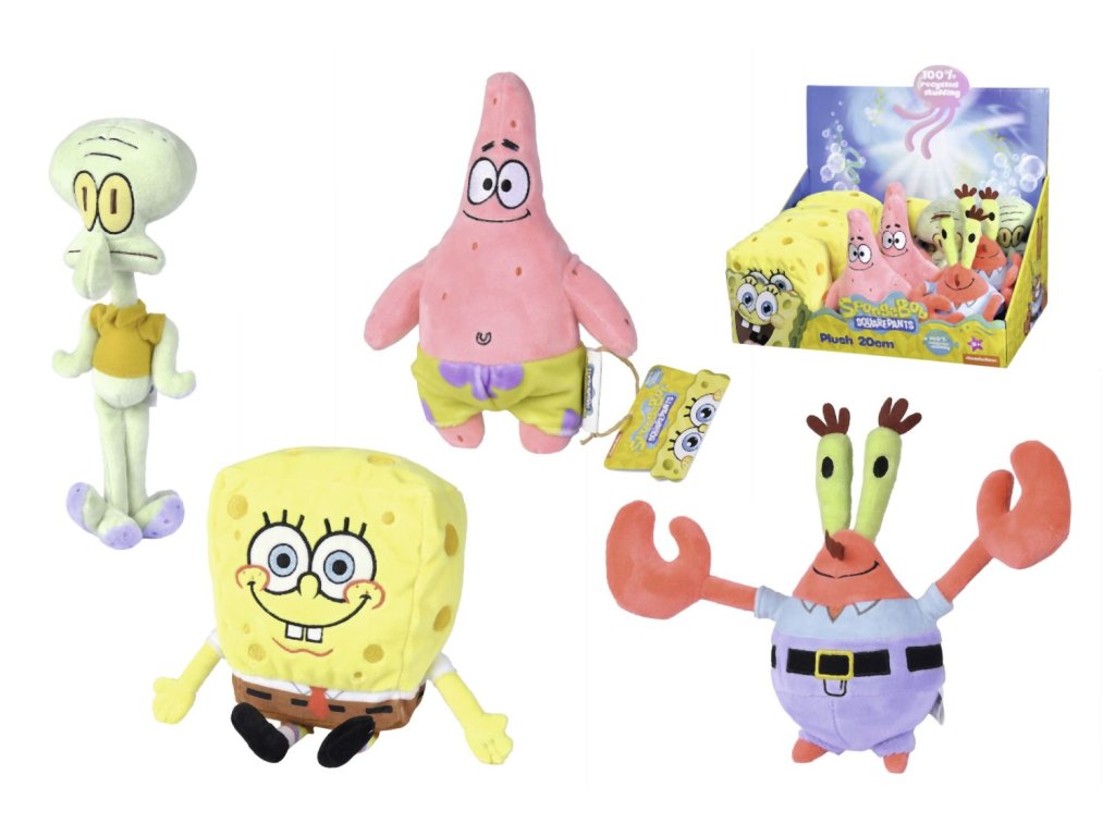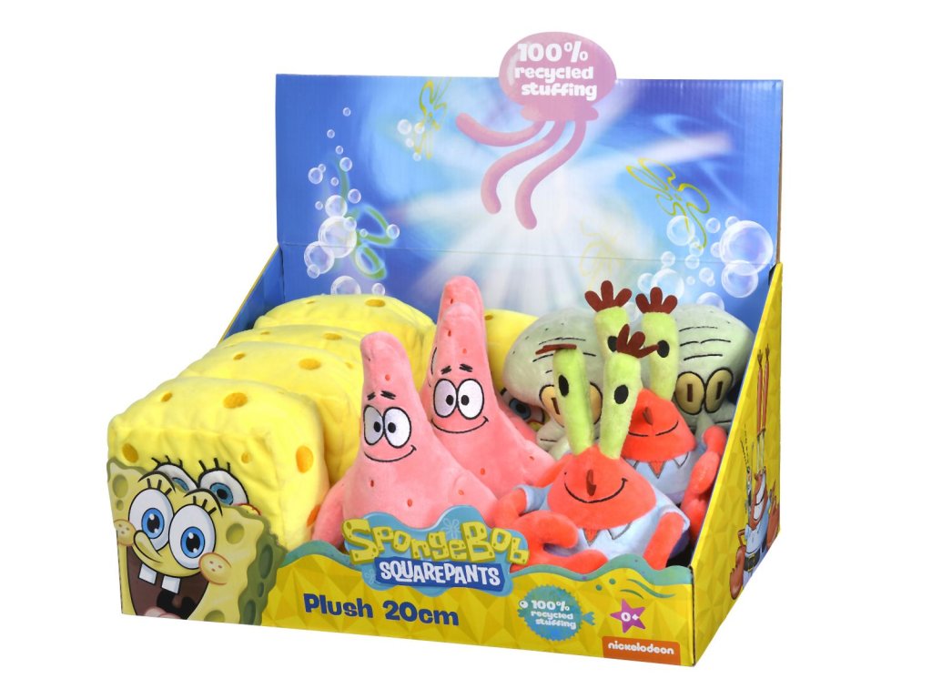 Plyšové postavy ze seriálu Spongebob v kalhotách 4 druhy - SpongeBob/Patrick/Sépiák/pan Krabs. S recyklovanou výplní v licenci Spongebob. Velikost 20 cm. Baleno v displeji po 12 kusech (5x Spongebob, 3x Patrick, 2x Sépiák a 2x pan Krabs).Doplňkové parametry