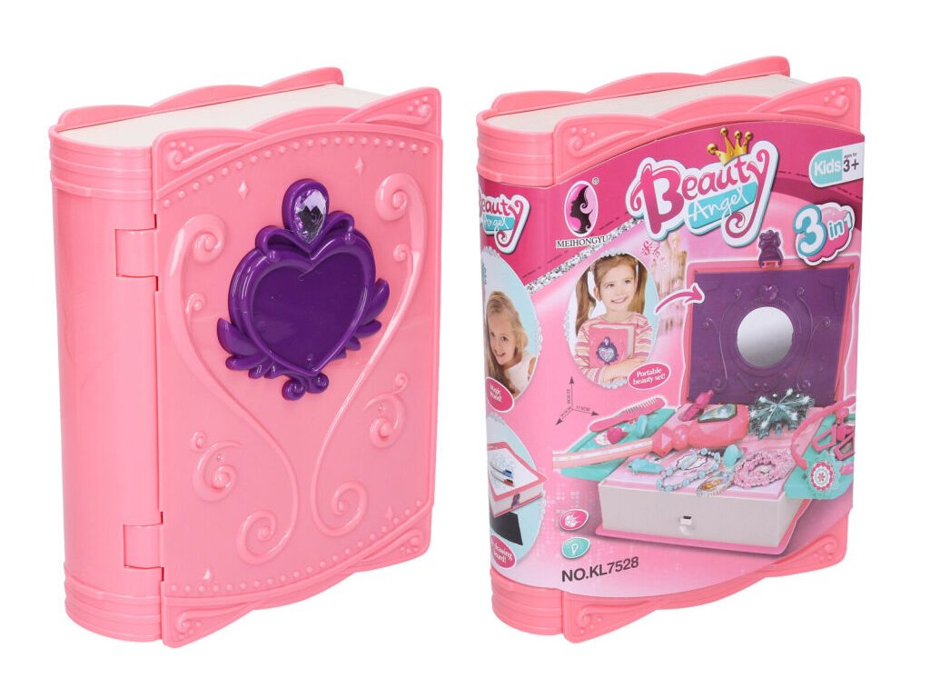 Šperkovnice. Rozměry 35,5x17,5x23 cm. Otevírací šperkovnice se zrcátkem. Obsahuje sponky, šperky, kouzelnou hůlku, náhrdelník, hřeben, čelenku, fixy na tabuli s hadříkem na mazání a s nalepovací popisovatelnou folií. Folie se nalepí na zadní stranu šperkovnice a slouží jako kreslicí tabulka. Kouzelná hůlka je na baterie. Po zapnutí svítí a hraje. 3xAG13 baterie do hůlky součástí.Doplňkové parametry