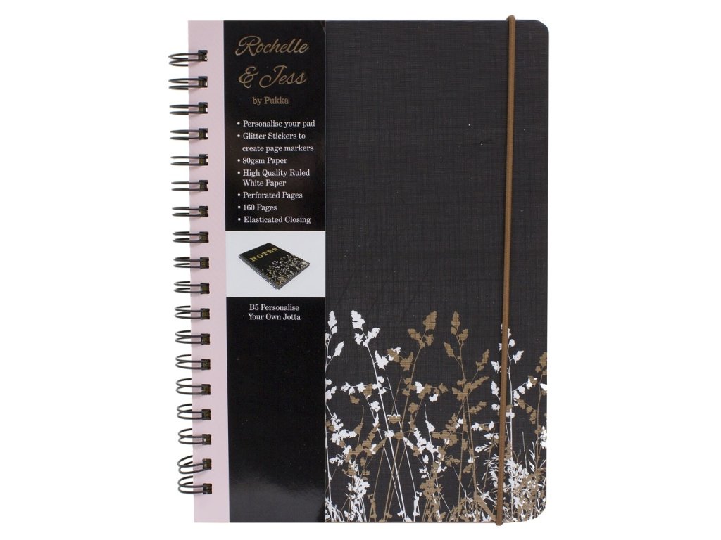 Exkluzivní spirálový blok B5 kolekce Rochelle & Jess s elastickým uzávěrem obsahuje: tvrdý obal, chránící proti poškození 80 linkovaných listů s linkami 8 mm, papír 80g/m2 2 abecední sady zlatých nalepovacích písmen pro personalizaci Exkluzivní design udělá z tohoto výrobku jak vhodný dárek, tak i vhodný poznámkový blok pro osobní použití. Velikost: B5 obsahuje 200 stran s linkami 8 mm rozměry 250 x 180 mm Obchodní informace: - výrobce: Pukka Pad, Velká Británie - kolekce: Rochelle Jess - výhradní zastoupení pro ČR: Reas-Pack s.r.o.Doplňkové parametry