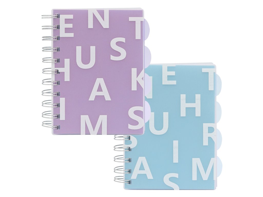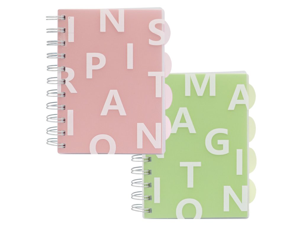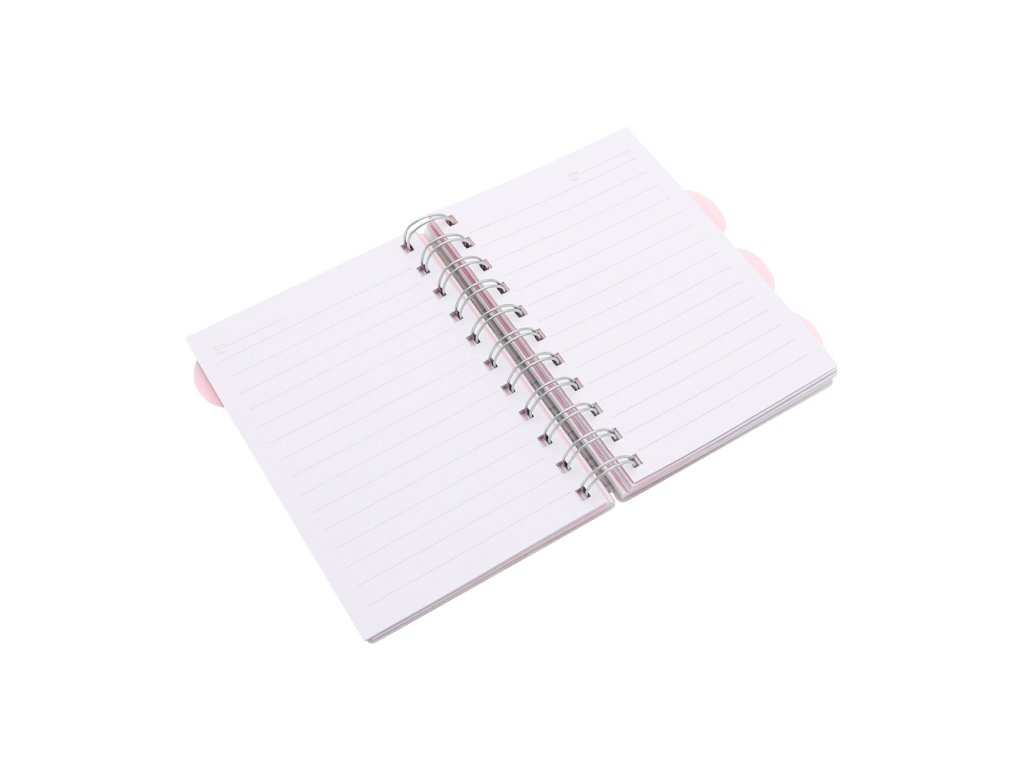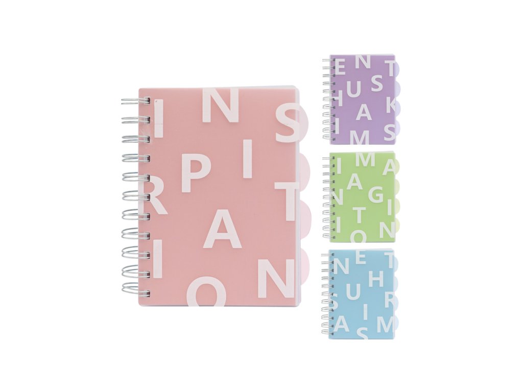Poznámkový blok s robustní spirálou pro pohodlné otáčení listů (4 pastelové barvy).- bílý, hladký papír s černými linky (rozestup linek 8,5 mm)