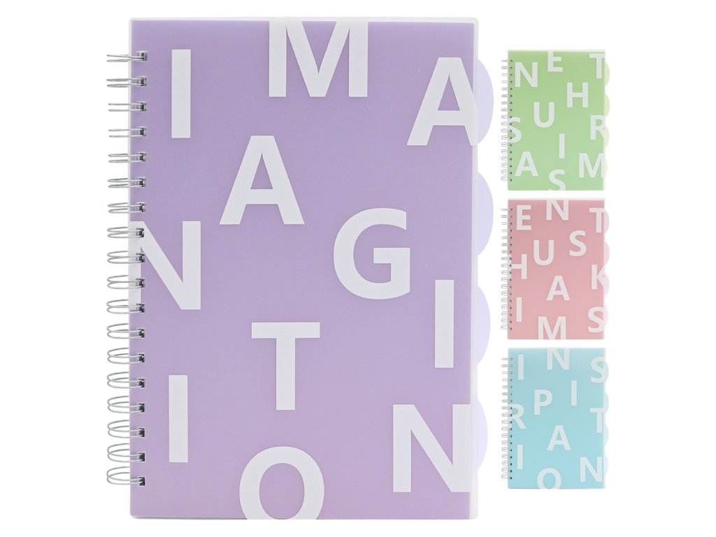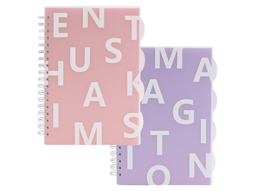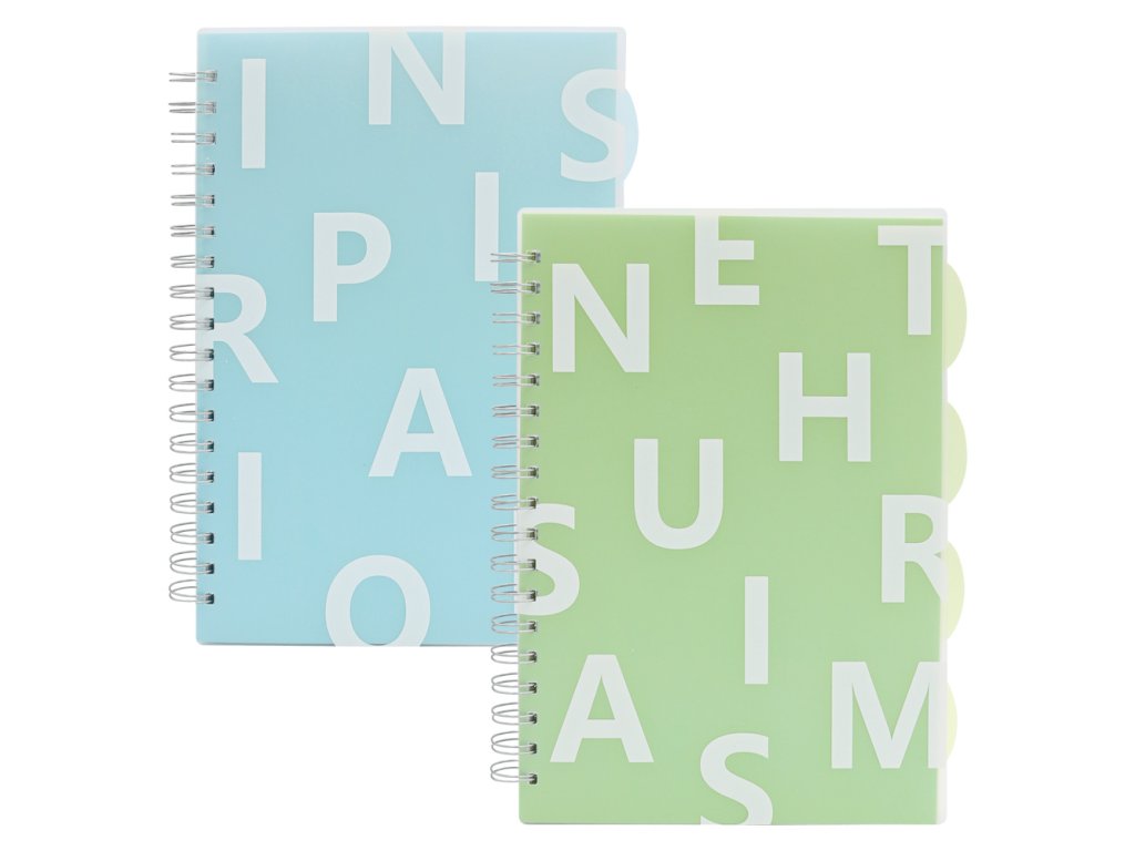 Poznámkový blok s robustní spirálou pro pohodlné otáčení listů (4 pastelové barvy).- bílý, hladký papír s černými linky (rozestup linek 10 mm)
