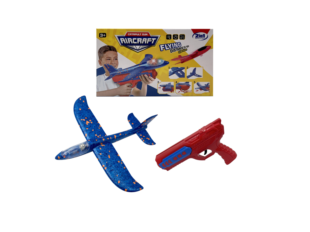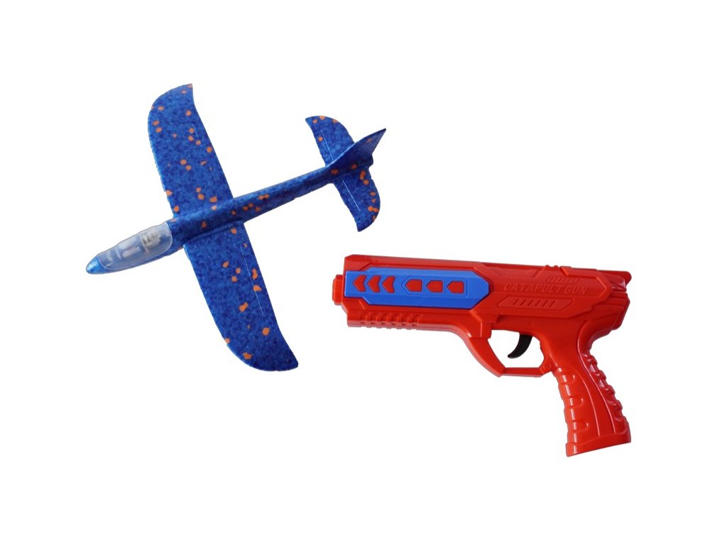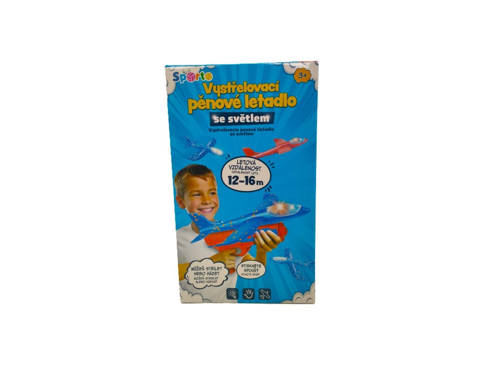 Pěnové letadlo s vystřelovací pistolí. Letadlo je vyrobeno z lehké a odolné pěnové hmoty. Díky tomu je bezpečné pro děti a vydrží i nějaký ten náraz. Jeho tvar je aerodynamický, navržený tak, aby při výstřelu co nejdále a nejstabilněji letělo. A co je na něm nejlepší? Že má v sobě svítící světýlko! To když letadélko letí vzduchem, takže je to moc hezké. K tomu letadélku dostaneš i takovou pistoli. Do té pistole se letadélko vloží a pak ho z ní můžeš vystřelit! Stačí jen natáhnout a zmáčknout spoušť a letadélko poletí vysoko do vzduchu. Proč je to tak super hračka? Je to zábava: Můžeš běhat a skákat, když letadélko letí. Světýlko je cool: Večer nebo když je šero, to světýlko krásně svítí. Je měkké: Nemusíš se bát, že se s ním uhodíš. Snadno se střílí: Pistoli zvládneš hned. Můžeš si hrát s kamarády: Kdo dostřelí dál? Kdo trefí cíl? S tímhle SPORTO Vystřelovacím pěnovým letadélkem se světýlkem zažiješ spoustu legrace venku. Tak pojď si hrát. Délka letu až 16 m.Doplňkové parametry