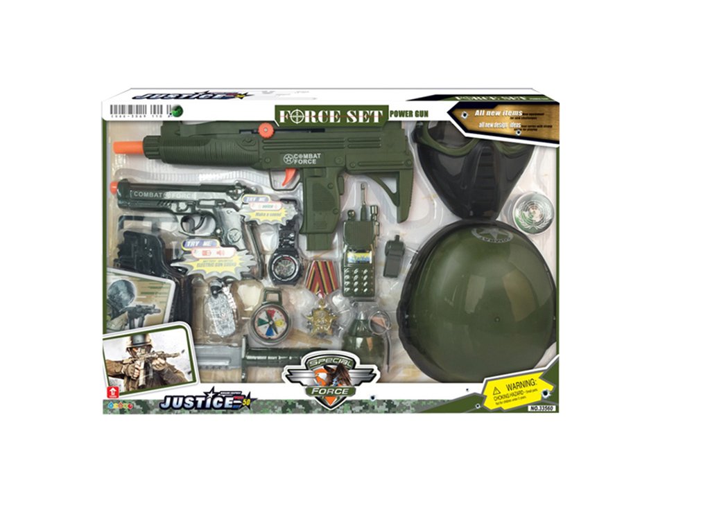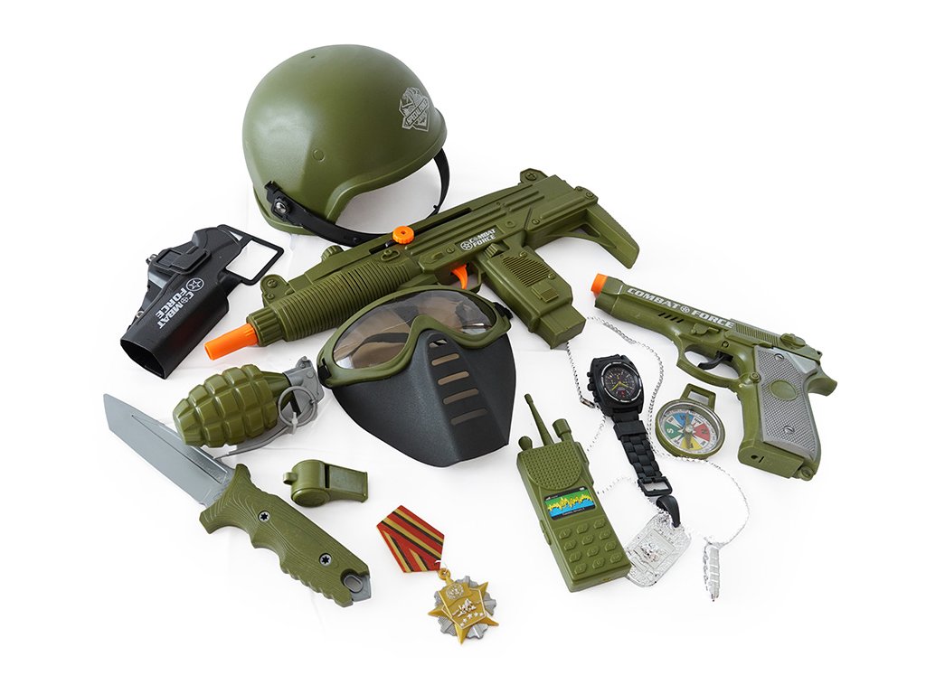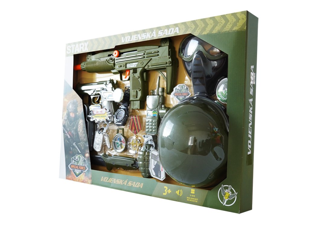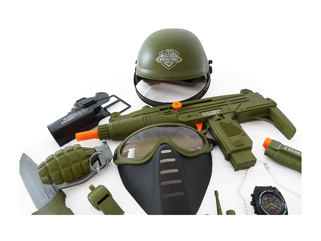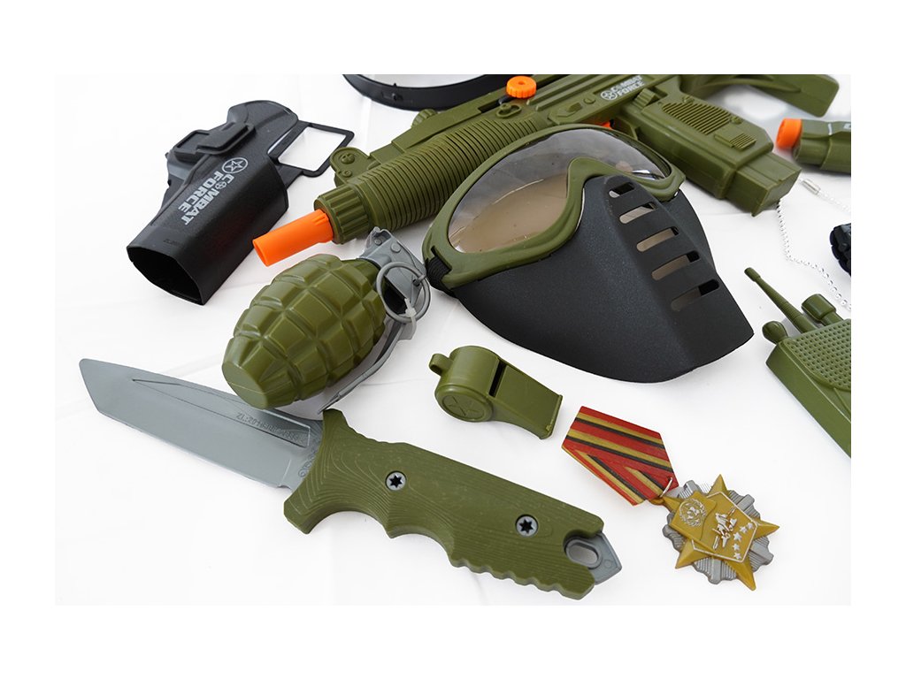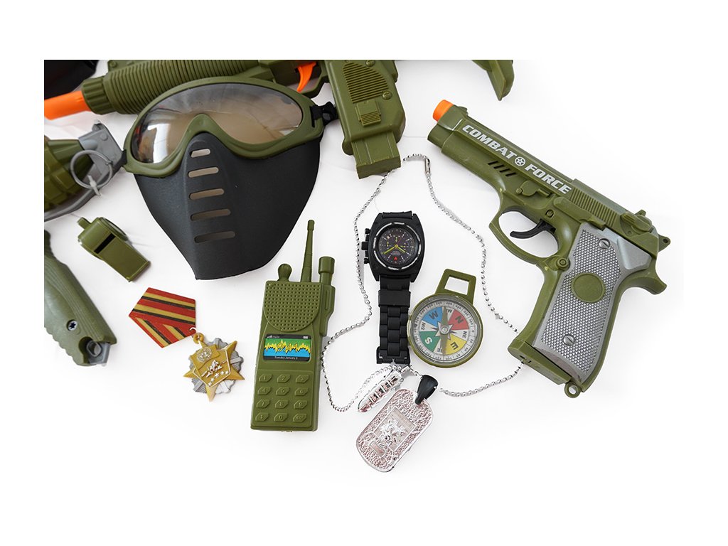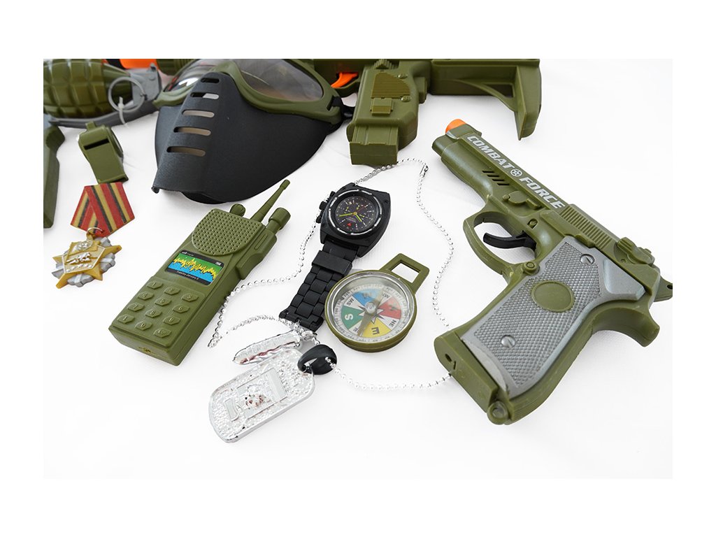 Tato bohatá vojenská sada je ideálním dárkem pro každého malého bojovníka. Balení obsahuje vše potřebné pro hodiny akčních her a dobrodružství. Najdete v něm helmu, dvě vojenské pistole, ale i granát, kompas a nůž. Součástí sady jsou také hodinky a další doplňky pro realistické zážitky. Tato hračka rozvíjí dětskou fantazii a podporuje kreativní hry, ve kterých se děti mohou cítit jako opravdoví hrdinové. Je to skvělý způsob, jak se bavit a přitom se učit o týmové práci.Doplňkové parametry
