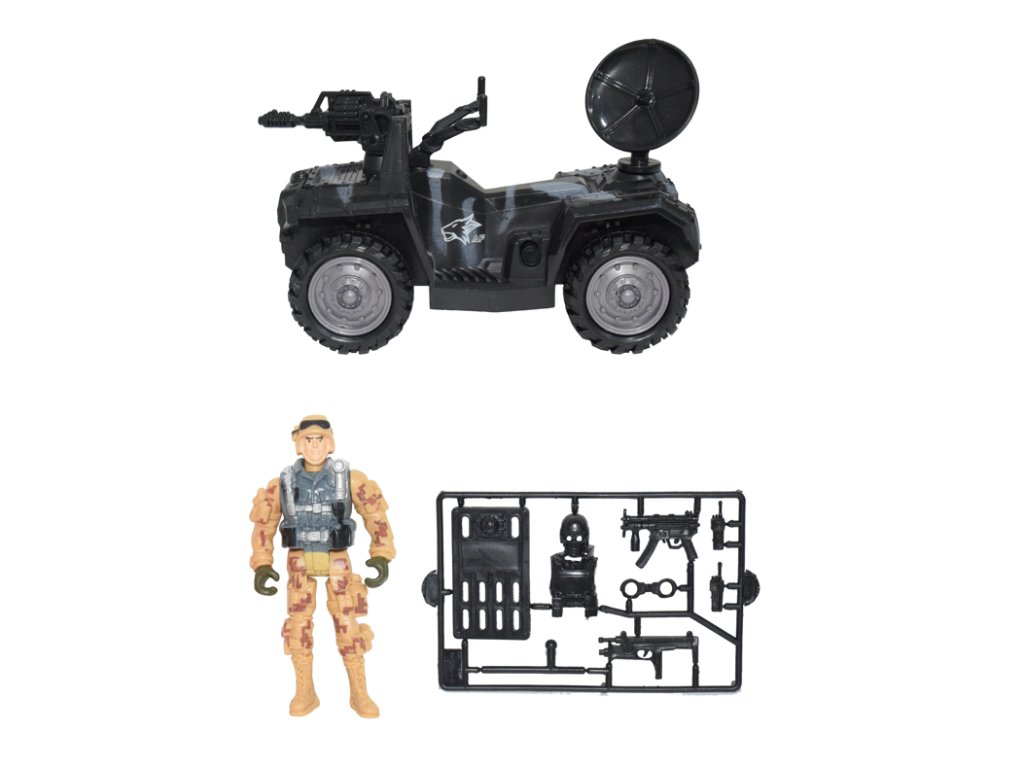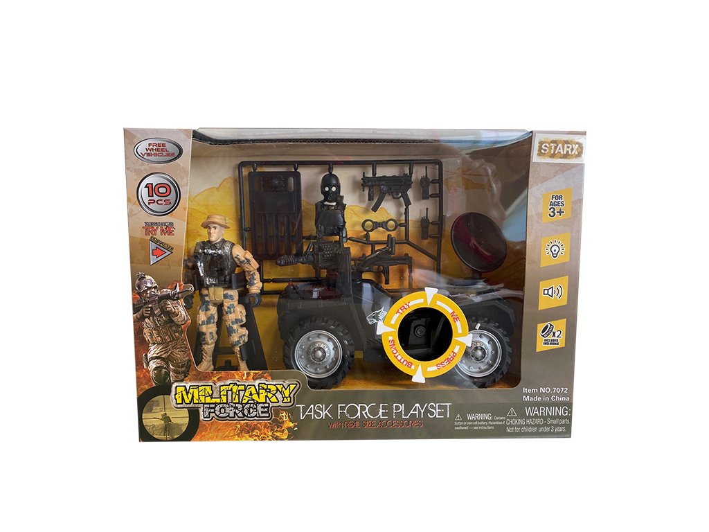 Vojenská sada se světelnými a zvukovými efekty. Obsahuje vojenské vozidlo, postavičku vojáka a další příslušenství.Doplňkové parametry