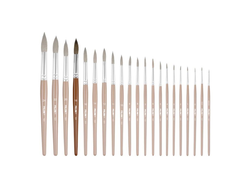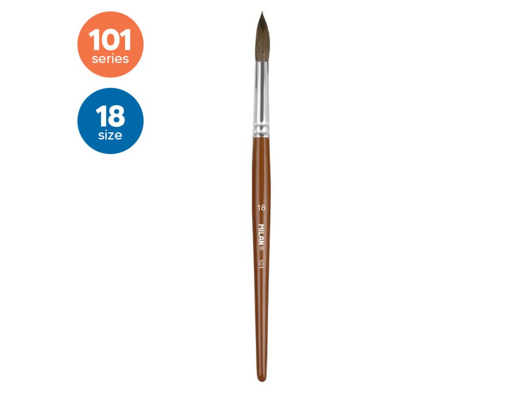 Kulatý štětec č. 18 z přírodního pony vlasu, s hnědou lakovanou rukojetí ze dřeva se stříbrným kováním, je díky jemnosti vlákna vhodný zejména pro použití ve školách na malbu akvarelovými a temperovými barvami. Složení: 70% přírodní kozí vlasy + 30% syntetické. Délka štětin: 30,5 mm. Průměr štětin: 8,2 mm. Délka štětce: 220 mm.Doplňkové parametry