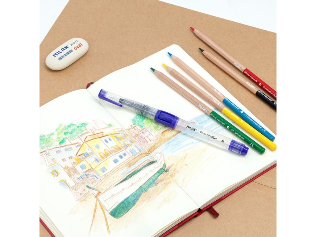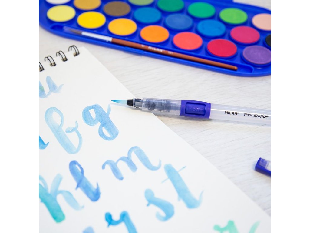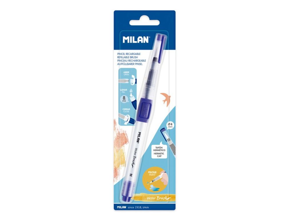 Štětec MILAN s nádobkou na vodu o objemu 8 ml. Šířka hrotu M, průměr 4 mm. Vhodný na práci s akvarelovými pastelkami, inkoustem, fixy. Pomocí tlačítka regulujete průtok kapaliny.Doplňkové parametry