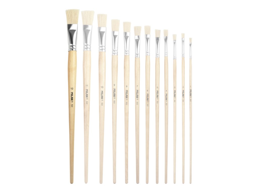 Plochý štětec MILAN 522 s dlouhou dřevěnou rukojetí. Přírodně zalakovaná povrchová úprava a hliníková dutinka. Složení: přírodní štětina prasat Chungking. Vhodný na malování olejem a akrylem. Průměr štětin: 22 mm. Délka štětin: 33,3 mm. Délka štětce: 340 mm.Doplňkové parametry