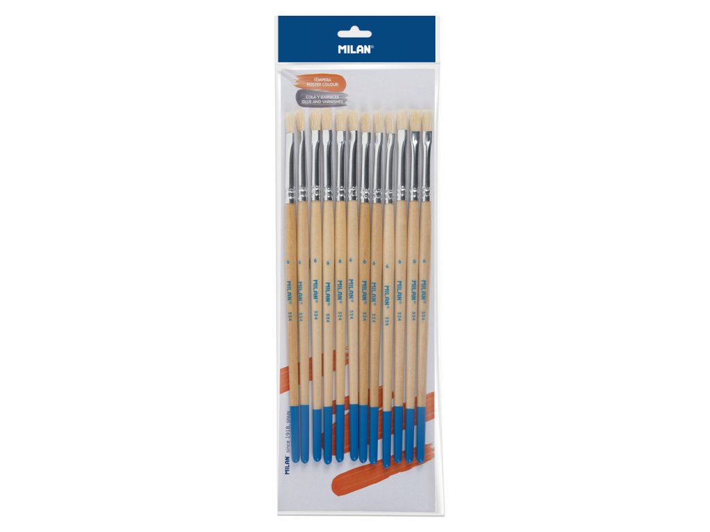Plochý štětec s krátkou dřevěnou rukojetí. Přírodně zalakovaná povrchová úprava a hliníková dutinka. Složení: přírodní štětina prasat Chungking. Vhodné na lepidlo, laky a tempery. Průměr štětin: 7,7 mm. Délka štětin: 11,4 mm. Délka štětce: 198 mm. Počet jednotek: 12.Doplňkové parametry