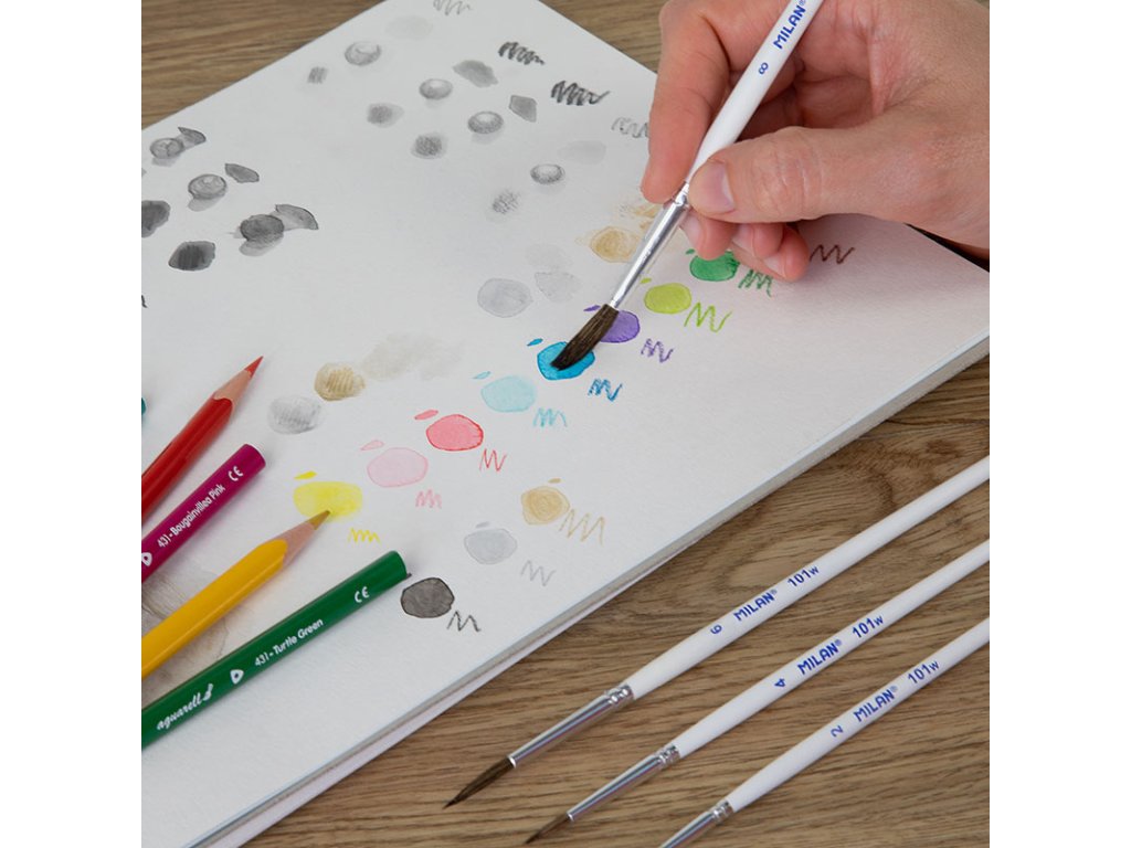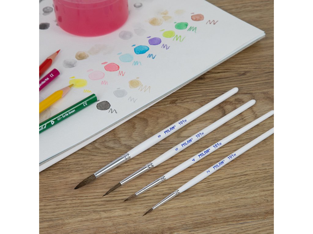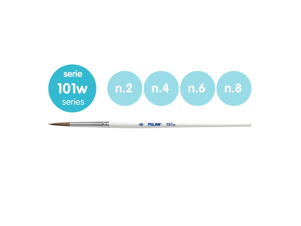 Guľatý štetec s krátkou drevenou rukoväťou. Biely lakovaný povrch a hliníková objímka. Zloženie: 70% prírodné kozie vlasy + 30% syntetické. Vhodné pre akvarel, vodné techniky a plagátovú farbu. Čísla 2, 4, 6 a 8. Séria 101w.Doplňkové parametry