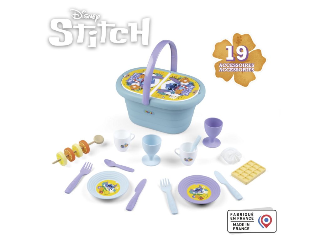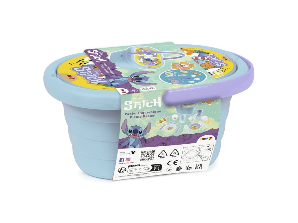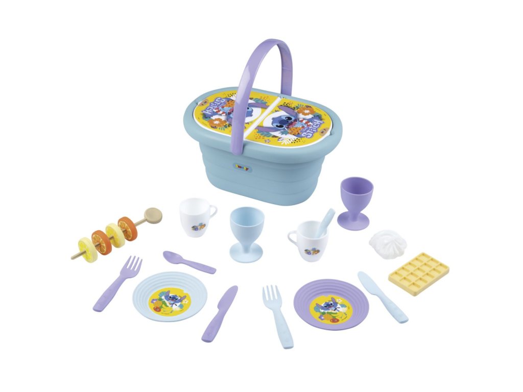 Piknikový koš s motivem Stitche si můžete vzít kamkoliv, díky ergonomické rukojeti je snadno přenosný. Součástí je 19 ks příslušenství: 2x šálky, 2x skleničky na stopce, 2x talíře, 2x lžíce, 2 vidličky, 2x nože, wafle, sněhová pusinka, špejle na ovoce a 4x plátky ovoce. Díky piknikovému koši Stitch si vaše dítě bude moci pozvat své kamarády a sdílet snimi svačinku se svými oblíbenými postavami.Doplňkové parametry