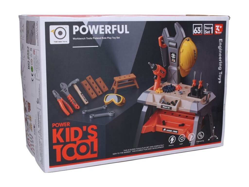 Stolek s nářadím. Rozměry 51x29x71 cm. Světelné efekty. 2xAA baterie do vrtačky nejsou součástí. Přepínač ON/OFF na vrtačce, přepínací tlačítko směru vrtání. Obsahuje stolek, svěrák, helmu, elektrickou vrtačku, pilku, 2 šroubováky, kladívko, hasák, kombinačky, 2 klíče, ochranné brýle, stoličku, 3 ozubená kolečka, 8 šroubů, 8 matic, 2 hmoždinky, 3 dřívka.Doplňkové parametry