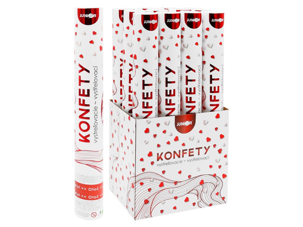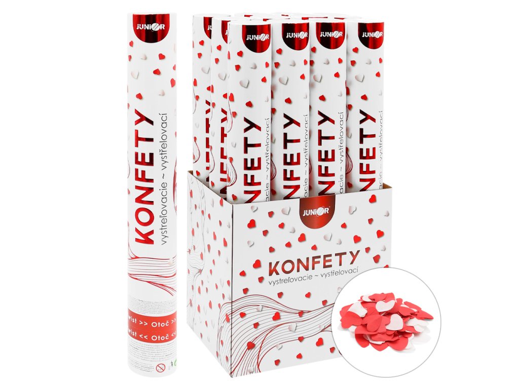 Střílející konfety - trubka 40 cm, bílá a červená papírová srdce