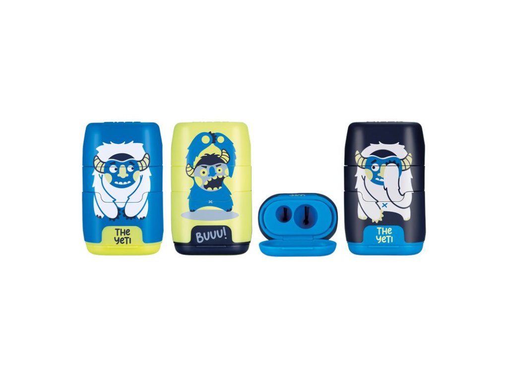 Kombinace pryže s dvojitým struhadlem (standardní a MAXI velikosti) se zásobníkem. čtvercová guma z měkké syntetické gumy bezpečnostní systém čepele, který zabraňuje oddělení čepele od těla struhadla k dispozici náhradní 430 gumy Ořezávátko má ostrou a odolnou ocelovou čepel, díky které je ideální pro všechny druhy tužek. 3 různé barvy: žlutá, modrá a námořnická modrá.Doplňkové parametry
