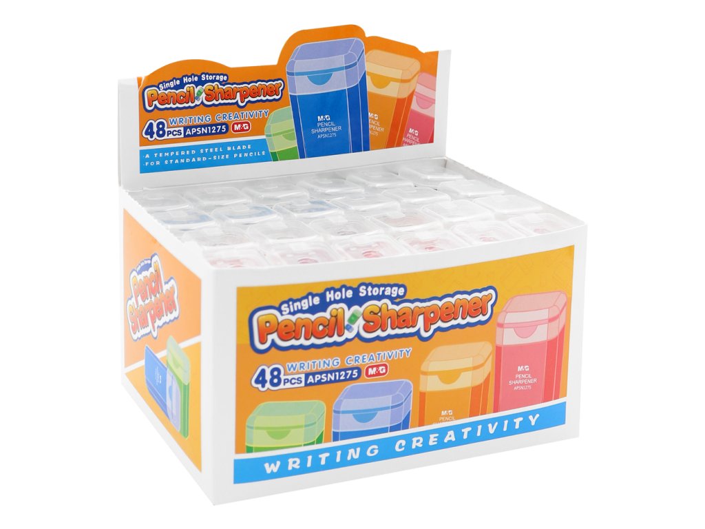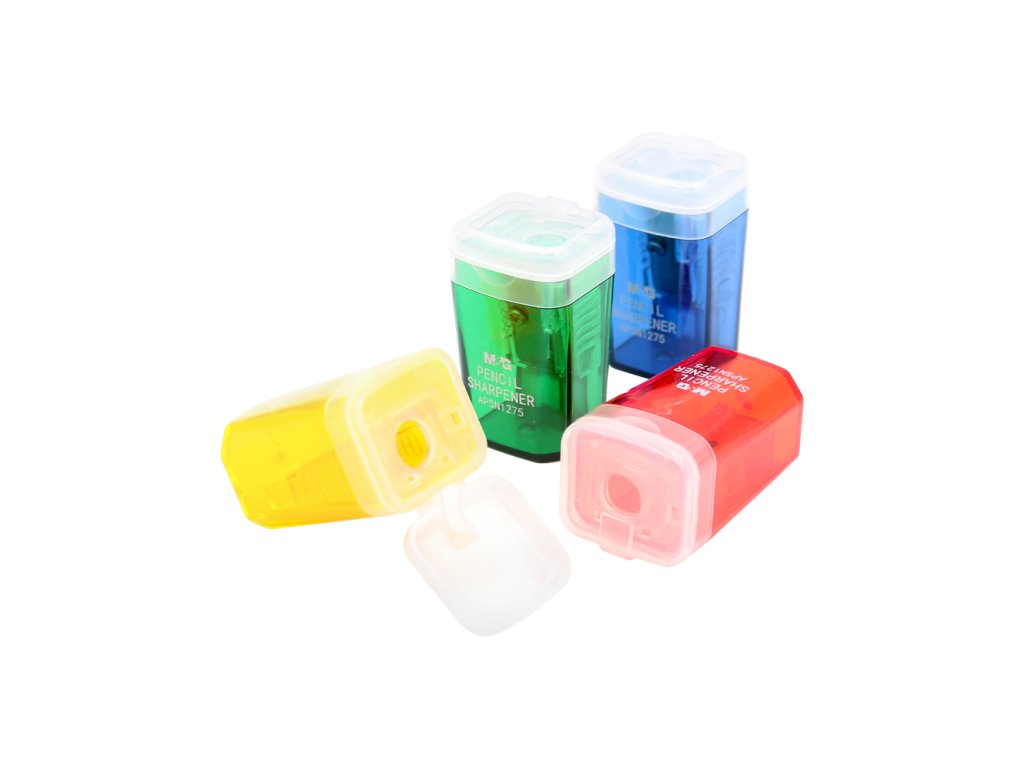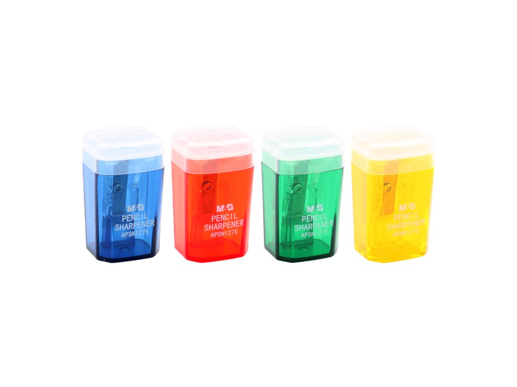 Struhadlo M&G jednoduché Mini se zásobníkem, vyrobeno z průhledného PVC materiálu. Zásobník má praktickou záklopku proti vysypání řízků. Vhodné pro použití ve škole i kanceláři. mix 4 barev: zelená, modrá, oranžová, červená průměr otvoru: 8 mmDoplňkové parametry