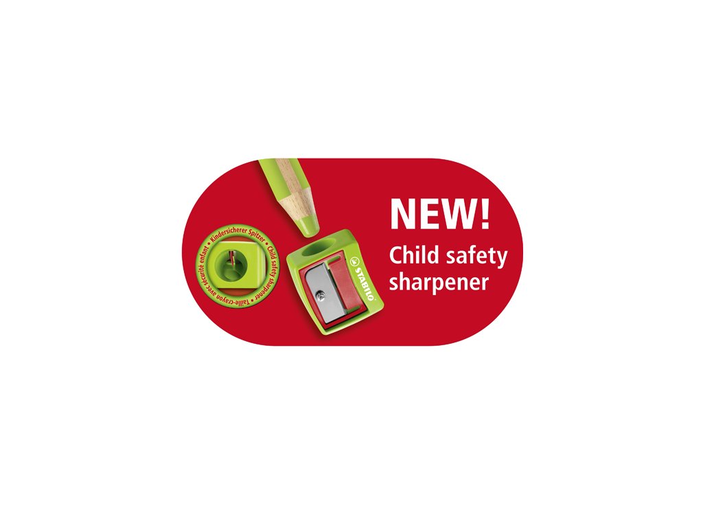 Struhadlo STABILO. Dětské plastové ořezávátko pro mimořádně hrubé tužky, pastelky do průměru 16 mm, jako například STABILO woody 3 v 1. V 2 barvách: červená a zelená.Doplňkové parametry