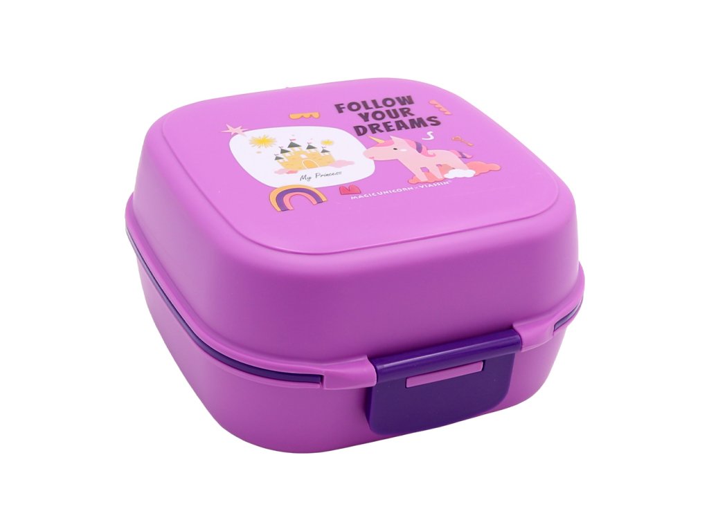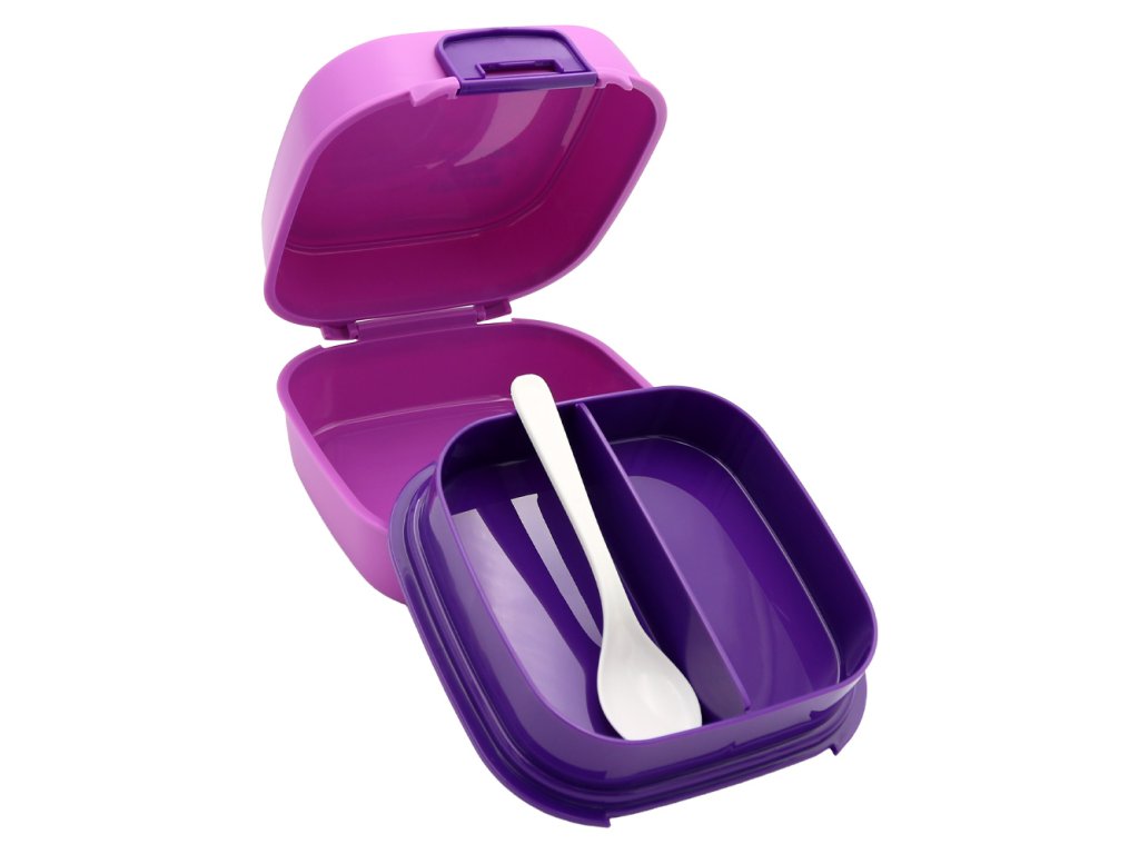 Plastový obědář pro děti poskytuje prostor pro hlavní jídlo ve spodní části a vyjímatelný vnitřek předělený přepážkou ve vrchní části na přílohy, ovoce apod.