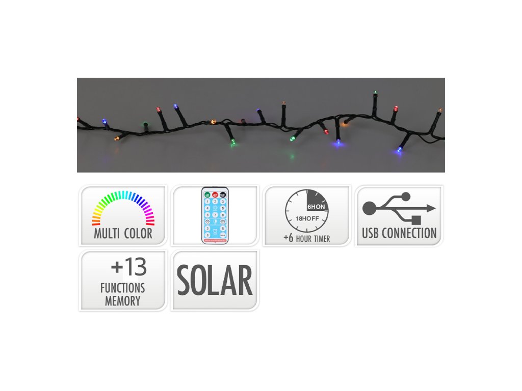 Světelný řetěz 480 LED barevné se solárním panelem, délka 21 m