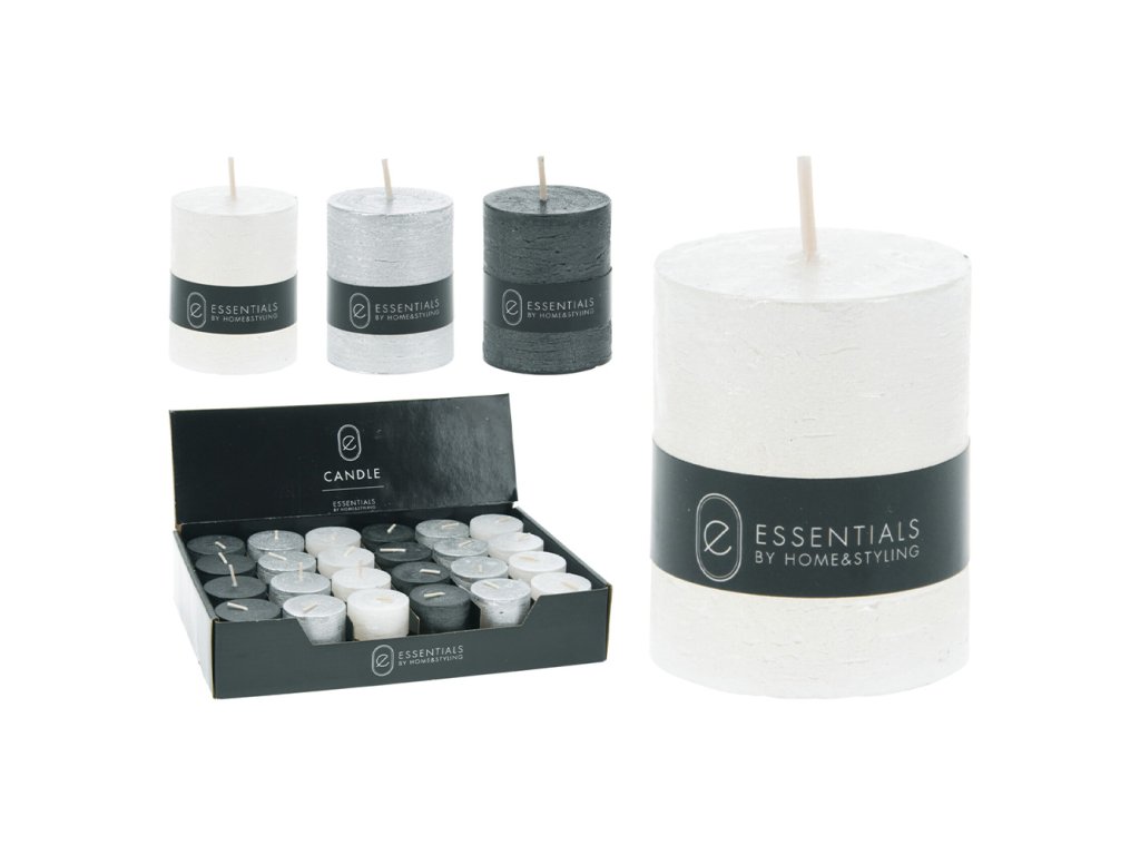 Svíčka parafínová, válcová 4 x 5 cm ve 3 barvách / bílá / stříbrná / černá.