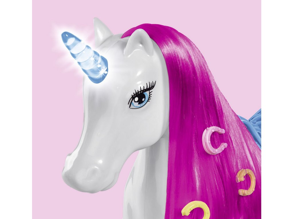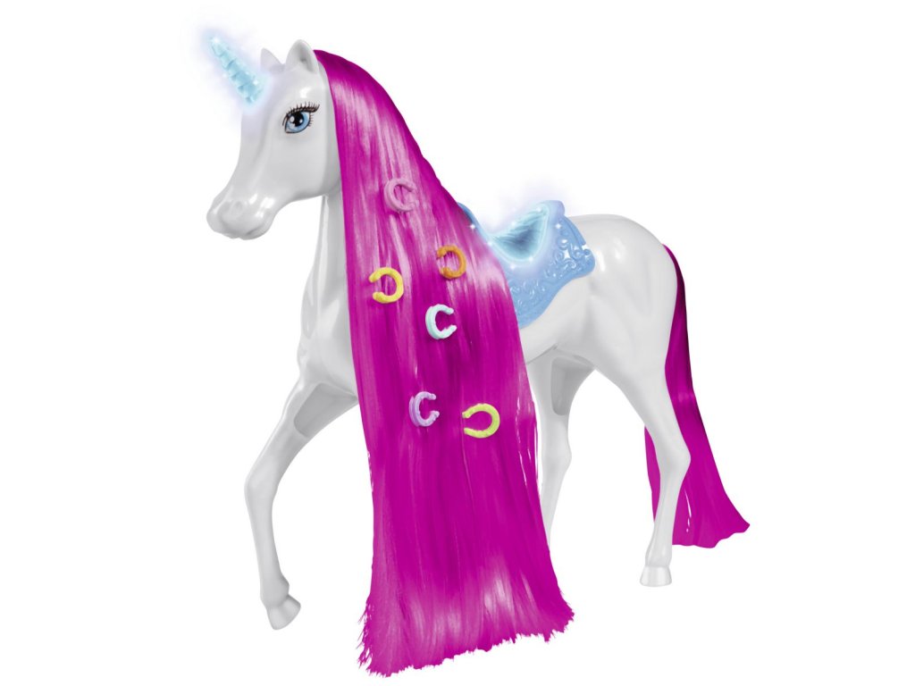 Jednorožec se svítícím rohem a sedlem, součástí ozdoby a hřeben na hřívu, pro panenky o velikosti 29 cm. Panenka není součástí.Doplňkové parametry