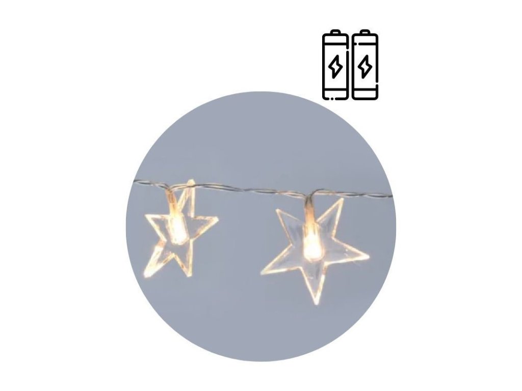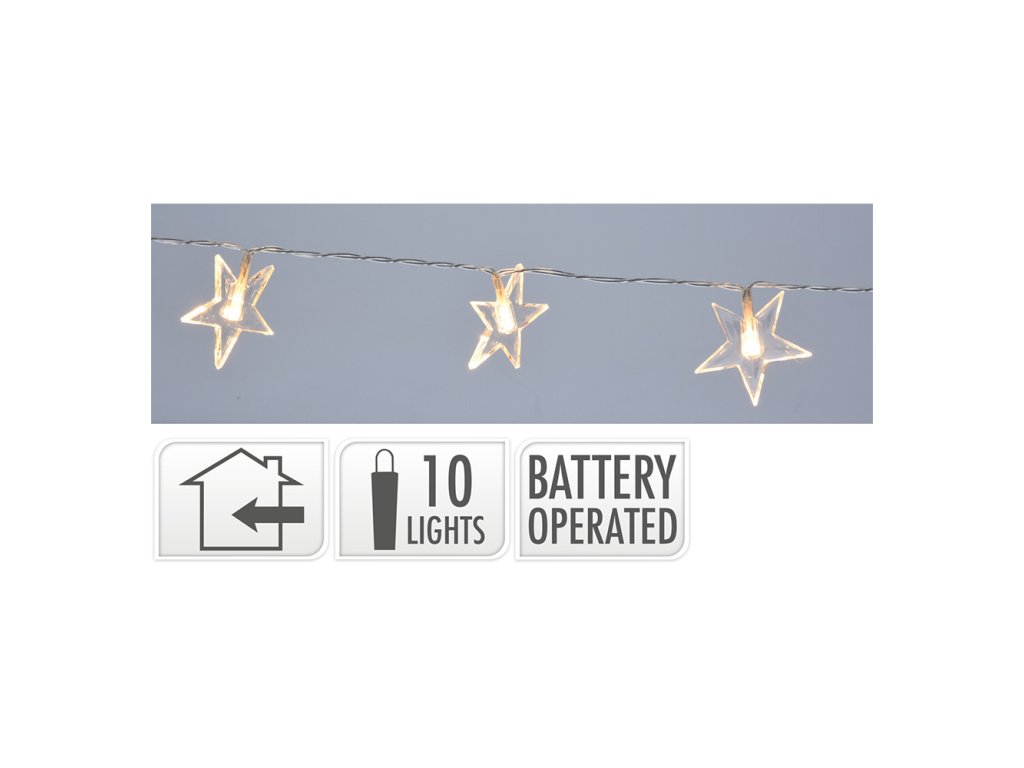 Vánoční dekorační osvětlení obsahuje 10 LED světel ve tvaru hvězdy - teplá bílá. Celková délka šňůry je 165 cm, z toho je 30 cm přívodní šňůra a 135 cm jsou světla. Vzdálenost mezi jednotlivými světly je 15 cm. Průměr hvězdy je 6 cm. Napájení na baterie 2xAA 1,5V, které nejsou součástí balení. Určeno jen do interiéru.Doplňkové parametry