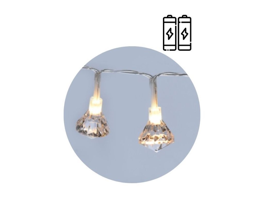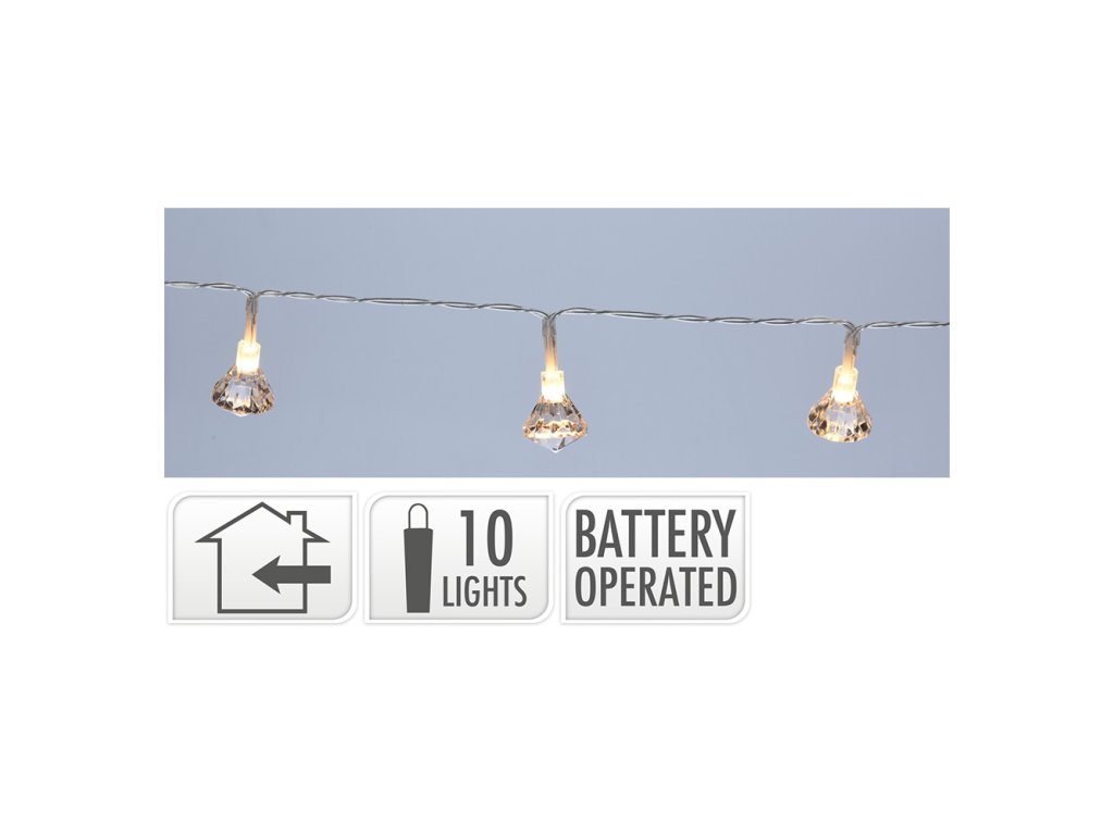Vánoční dekorační osvětlení obsahuje 10 LED světel ve tvaru hvězdy - teplá bílá. Celková délka šňůry je 165 cm, z toho je 30 cm přívodní šňůra a 135 cm jsou světla. Vzdálenost mezi jednotlivými světly je 15 cm. Průměr hvězdy je 6 cm. Napájení na baterie 2xAA 1,5V, které nejsou součástí balení. Určeno jen do interiéru.Doplňkové parametry