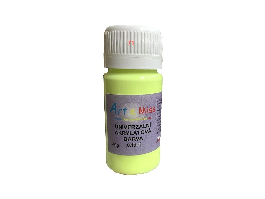 Univerzální akrylátová barva, která po nasvícení svítí ve tmě. Intenzitu a délku ovlivníte dobou nasvícení, buď na denním světle, baterkou nebo lampičkou. Pokud chcete zvýšit intenzitu svícení, přidejte do barvy svítící prášek. Barva vydrží svítit 2-6 hodin. Pro malování na nasákavé povrchy jako je dřevo, papír, terakotu, beton, korek a další materiály. Použití Vodou ředitelná, to znamená, že pomůcky umyjete obyčejnou vodou a nepotřebujete žádná zvláštní ředidla. Pokud ovšem barva zaschne můžete ji většinou odstranit lihem. Pokud potřebujete barvu řidší, můžete ji mírně naředit vodou. Ředěním ale také snížíte také svítivost. Lahvičku dobře protřepejte, nebo promíchejte. Barvu nanášejte na čistý, suchý povrch a nechte zaschnout. Když jedna vrstva nestačí, aplikujte druhou. Pracovní pomůcky umyjte vodou. Zabraňte zaschnutí. Barva málo kryje. Tmavé povrchy natřete bílou barvou. Někdy stačí natřít více vrstev. Skladování Skladujte v dobře uzavřených obalech, při pokojové teplotě. Zabraňte přímému slunečnímu svitu a vysokým teplotám. Nesmí zmrznout. Rozvrstvení barvy při delším skladování není na závadu.¨ Na výběr několik druhů barev: 71- žlutá 72- světle oranžová 73- oranžová 74- červená 81- růžová 82- fialová 83- modrá 84- zelená Požadovanou barvu prosím uveďte do poznámkyDoplňkové parametry