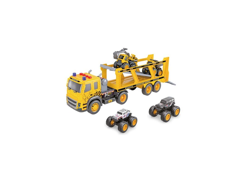 Tahač se 4 auty a efekty. Velikost tahače 45 cm, malých aut 8-10 cm. Na setrvačník. Světelné a zvukové (couvání, troubení, zvuk plošiny, motor) efekty na kabině tahače. 3xAG13 baterie do tahače součástí.Doplňkové parametry