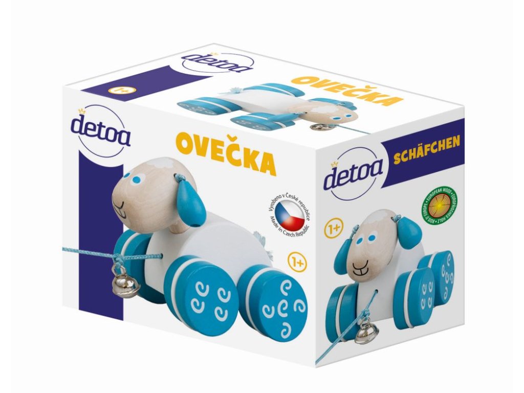 Tahací hračka s rolničkou v podobě ovečky. Ovečka doprovází děti při jejich prvních krůčcích. Výrobek splňuje požadavky EU na bezpečnost hraček a je vhodný pro děti od 1 roku. Rozměry výrobku jsou 125x105x75 mm. Baleno v papírové krabičce.Doplňkové parametry