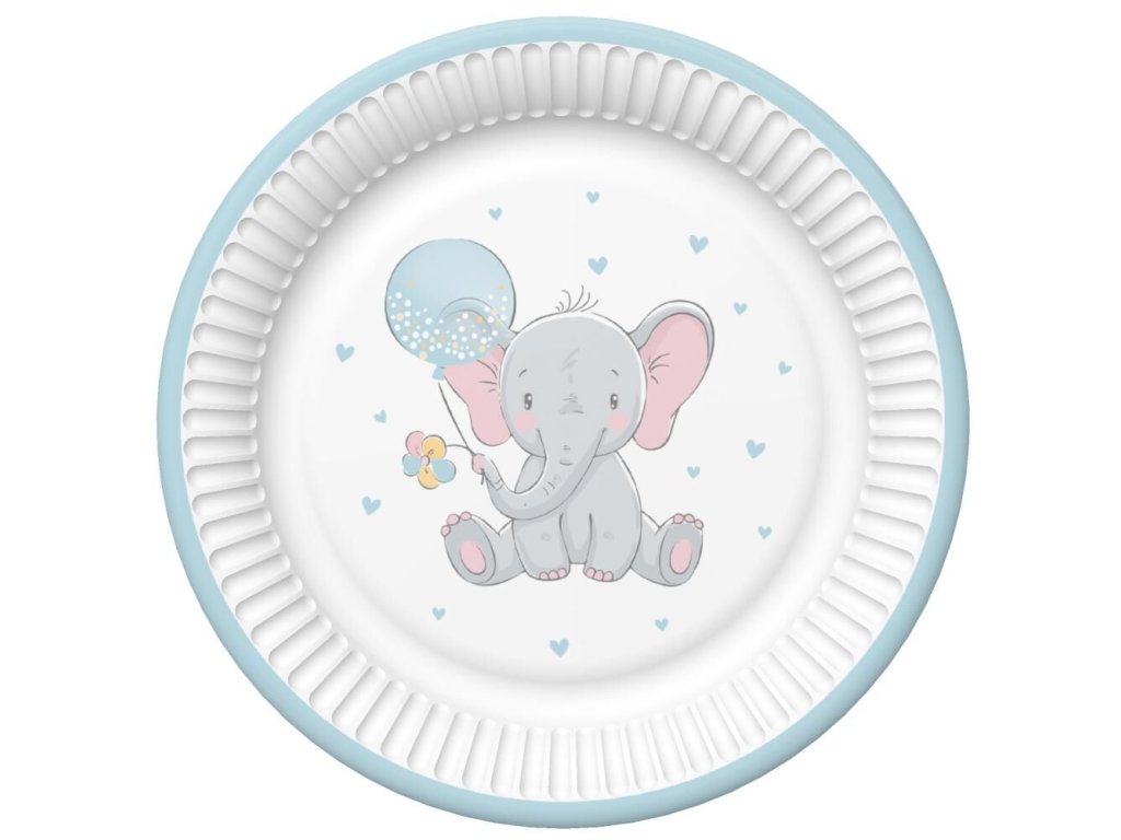 Papírové talíře Baby Elephant with Blue Balloon, průměr 23cm, balení obsahuje 8ks. Papírové talíře jsou ideálním řešením pro snadné stolování bez nepořádku.Doplňkové parametry