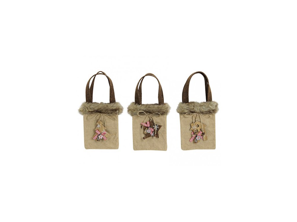 Vánoční jutová taška - 3 motivy. Taška z juty má dvě rukojeti na nošení. Na okraji tašky je kožešina. Na přední straně je dřevěná hvězda, stromeček nebo domeček s přívěskem a nápisem "Merry Christmas". Jutová taška je ideální na balení dárků, sladkostí atd.Doplňkové parametry