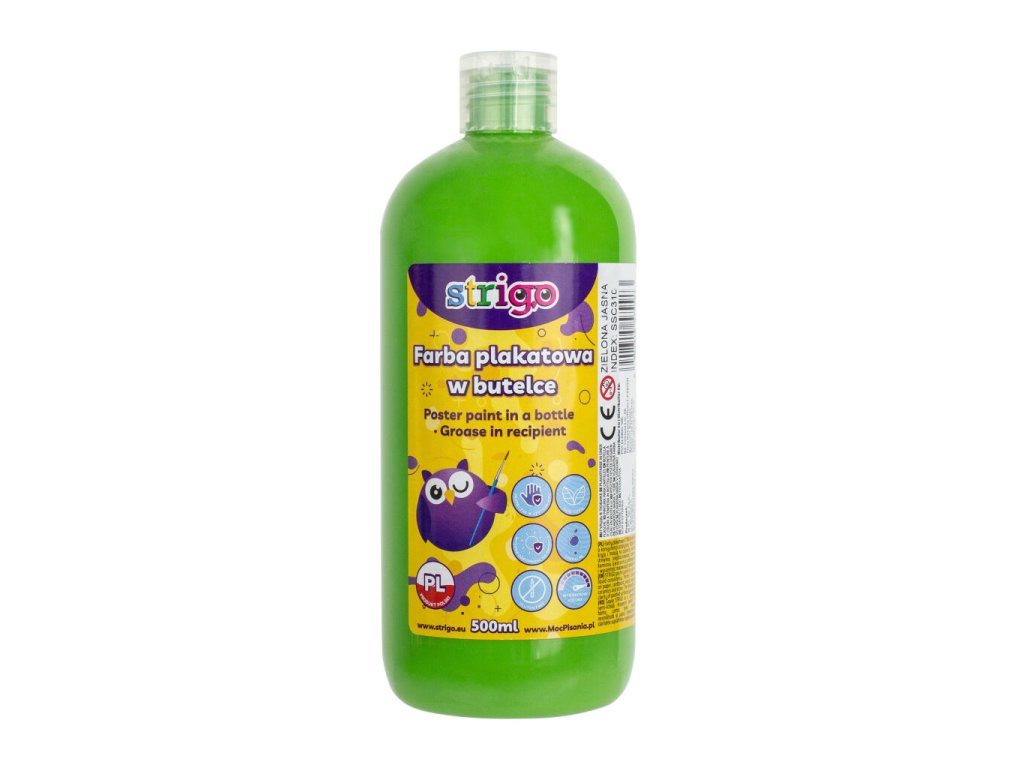 Plakátové barvy STRIGO v lahvičce s polotekutou konzistencí, která usnadňuje nanášení barvy a míchání barev. Dokonale kryjí a jsou vhodné na mnoho povrchů. Jsou perfektní pro malování na papír, karton, dřevo, neglazovanou keramiku a kámen. Barvy jsou odolné vůči světlu a oděru. Pohodlné a rychlé použití. Byly vyrobeny na bázi nejkvalitnějších pigmentů, které zaručují intenzitu a čistotu lakovaných povrchů. Lze prát z většiny tkanin. Barvy v plastových lahvích 500 ml. Různé barvy na výběr. Vhodné pro děti starší 3 let.Doplňkové parametry