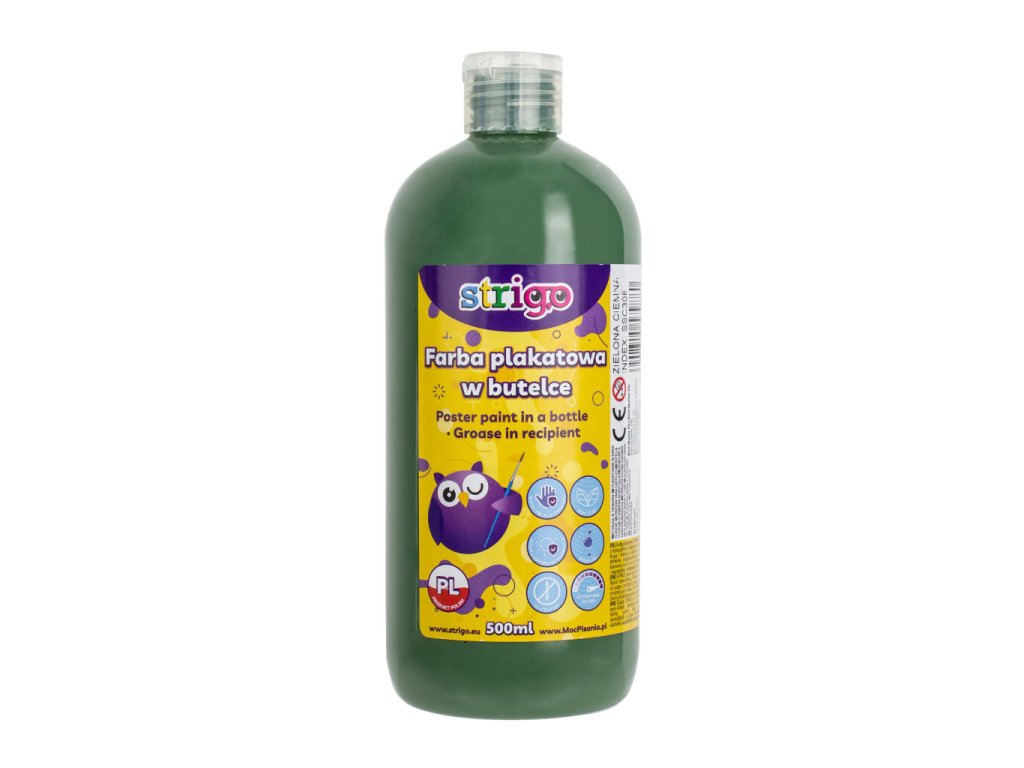 Plakátové barvy STRIGO v lahvičce s polotekutou konzistencí, která usnadňuje nanášení barvy a míchání barev. Dokonale kryjí a jsou vhodné na mnoho povrchů. Jsou perfektní pro malování na papír, karton, dřevo, neglazovanou keramiku a kámen. Barvy jsou odolné vůči světlu a oděru. Pohodlné a rychlé použití. Byly vyrobeny na bázi nejkvalitnějších pigmentů, které zaručují intenzitu a čistotu lakovaných povrchů. Lze prát z většiny tkanin. Barvy v plastových lahvích 500 ml. Různé barvy na výběr. Vhodné pro děti starší 3 let.Doplňkové parametry