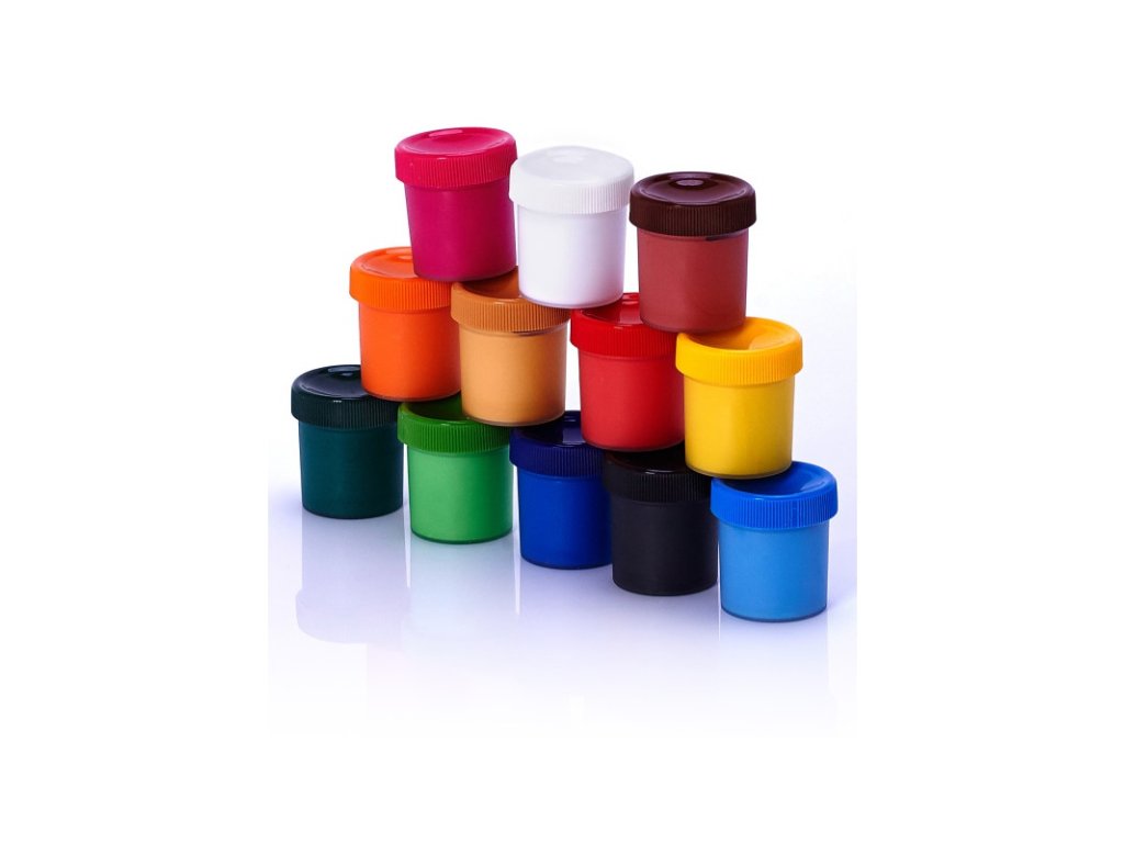 • balení obsahuje 12 barev po 20ml v praktických plastových kelímcích (bílá, žlutá, oranžová, růžová, okrová, světle modrá, tmavě modrá, světle zelená, tmavě zelená, červená, hnědá, černá)