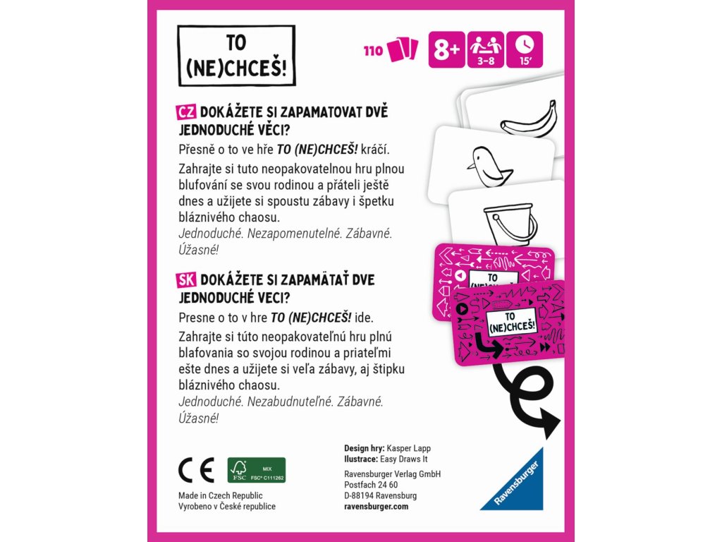 Dokážete si zapamatovat dvě jednoduché věci? Přesně o to ve hře TO (NE)CHCEŠ! Kráčí. Zahrajte si tuto neopakovatelnou hru plnou blufování se svou rodinou a přáteli ještě dnes a užijete si spoustu zábavy i špetku bláznivého chaosu. Jednoduché. Nezapomenutelné. Zábavné. Úžasné!Doplňkové parametry