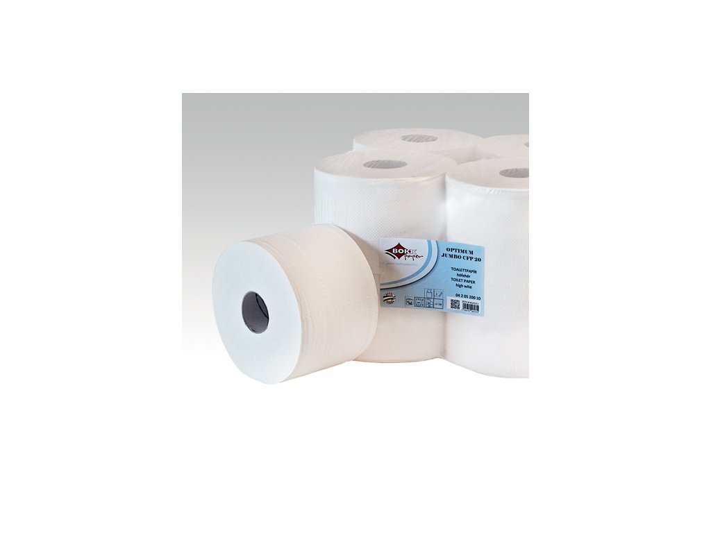 Toaletní papír Optimum Jumbo CFP20 - (doporučený zásobník na toaletní papír T64, KOD: 39201). Toaletní papír: 2 vrstvý, 100% celulóza, průměr kotouče 20 cm, délka role 180 m, útržky 13,5x20.Doplňkové parametry
