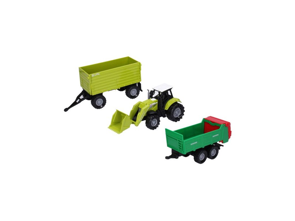 Traktor se zvukovými efekty set s přívěsem. Volná kola. Rozměry traktoru 15x6x7 cm. Obsah balení - traktor, 2xpřívěs 15x6x7 cm. Vydává světelné a zvukové efekty. Aktivace tlačítkem v přední části traktoru. 3xAG13 (1,5V) baterie, součástí balení.Doplňkové parametry