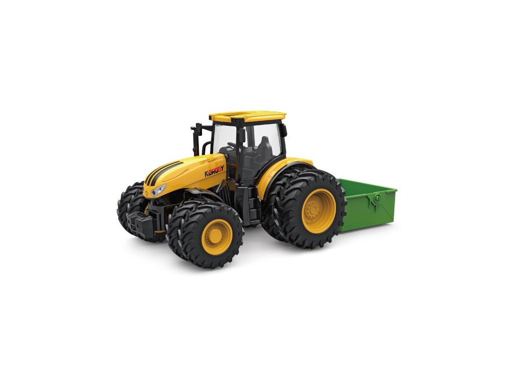 Traktor s příslušenstvím. Rozměry 27,5x10,5x12 cm. Dvojitá kola. Na setrvačník. Světelné a zvukové efekty. 3xAG13 baterie součástí.Doplňkové parametry