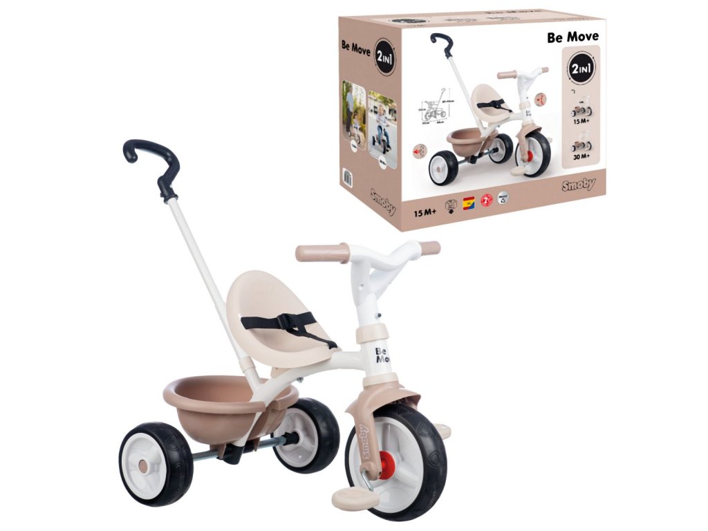 Šlapací tříkolka pro kluky i holčičky v béžové barvě má kovový rám, nastavitelnou a odnímatelnou vodící tyč (3 výškové úrovně, max. 95 cm), protiskluzové pedály s možností zablokování šlapání, nastavitelné ergonomické sedadlo na 2 pozice, bezpečnostní pás, výklopný plastový košík a tichá kolečka. Nosnost 50 kg. Rozměry: 68 x 52 x 52 cm. Hmotnost: 3,479 kg.Doplňkové parametry