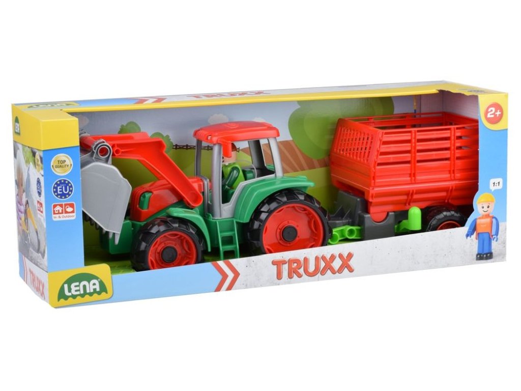 Truxx traktor se lžící a vozíkem z kvalitního plastu a velmi pevnou stavbou. Plně mechanicky funkční. Obsahuje odklopitelnou kabinu s aktivním panáčkem. Vyrobeno v ČRDoplňkové parametry