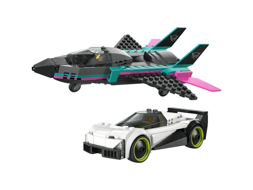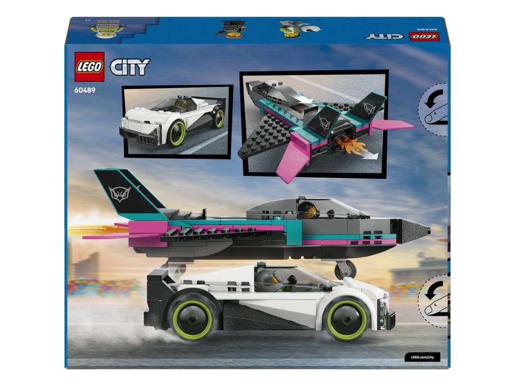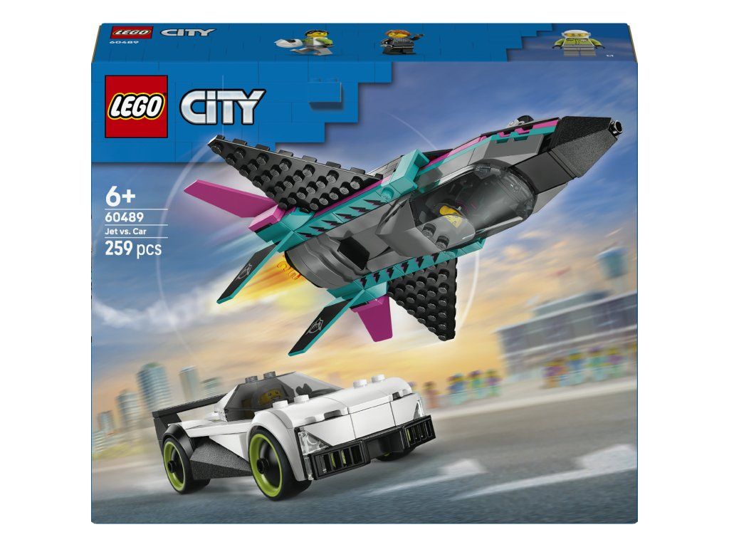 Dvojitá stavebnice LEGO® City Tryskáč vs. auto (60489) obsahuje elegantní supersportovní auto a nadzvukové letadlo, se kterými si malí stavitelé užijí hodiny závodění. Model tryskáče má křídla se šípovitým profilem, dvojitá vertikální křidélka a stabilizátory. Děti můžou zapnout přídavné spalování tryskáče posunutím páčky a otevřít kokpit supersportovního auta, aby si prohlédly propracovaný interiér se závodním sedadlem. Usaďte minifigurky pilota a závodního řidiče a odstartujte strhující závody. S touto stavebnicí letadla a auta bude každý den jedinečný – skvěle se hodí jako dárek pro kluky a holky od 6 let, kteří milují hračky v podobě závodních aut a modelů letadel. Zkombinujte ji s dalšími stavebnicemi z řady LEGO® City (prodávají sesamostatně) a zažijte akční dobrodružství po celém městě. Tato stavebnice vozidel LEGO obsahuje sportovní auto a tryskové letadlo. Děti se můžou těšit na ještě větší porci zábavy díky aplikaci LEGO Builder, ve které můžou modely přibližovat, otáčet ve 3D a sledovat svůj pokrok při stavění. Stavebnice obsahuje 259 dílků.Doplňkové parametry