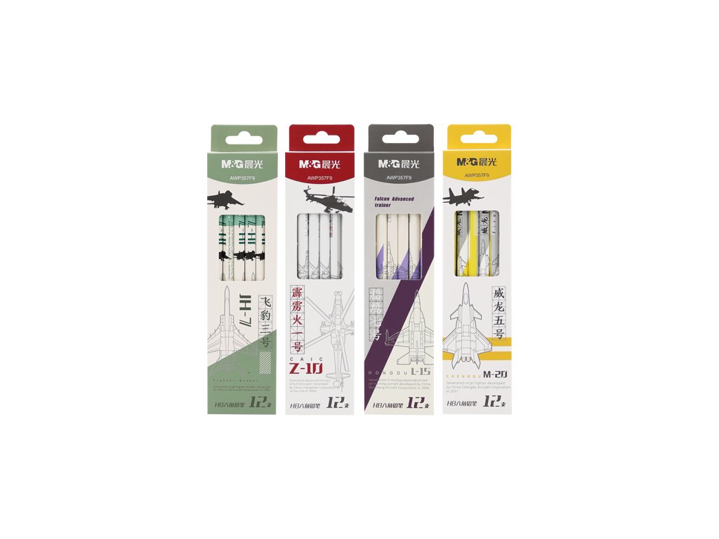 Šestihranné tužky v army motivech helikoptéra a 3 různé stíhačky (4 motivy).